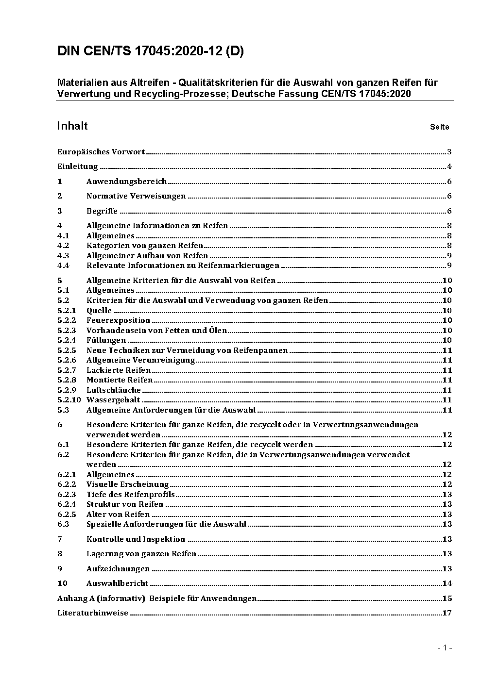Materials obtained from end-of-life tyres - Quality criteria for the selection of whole tyres, for recovery and recycling processes; German version CEN/TS 17045:2020