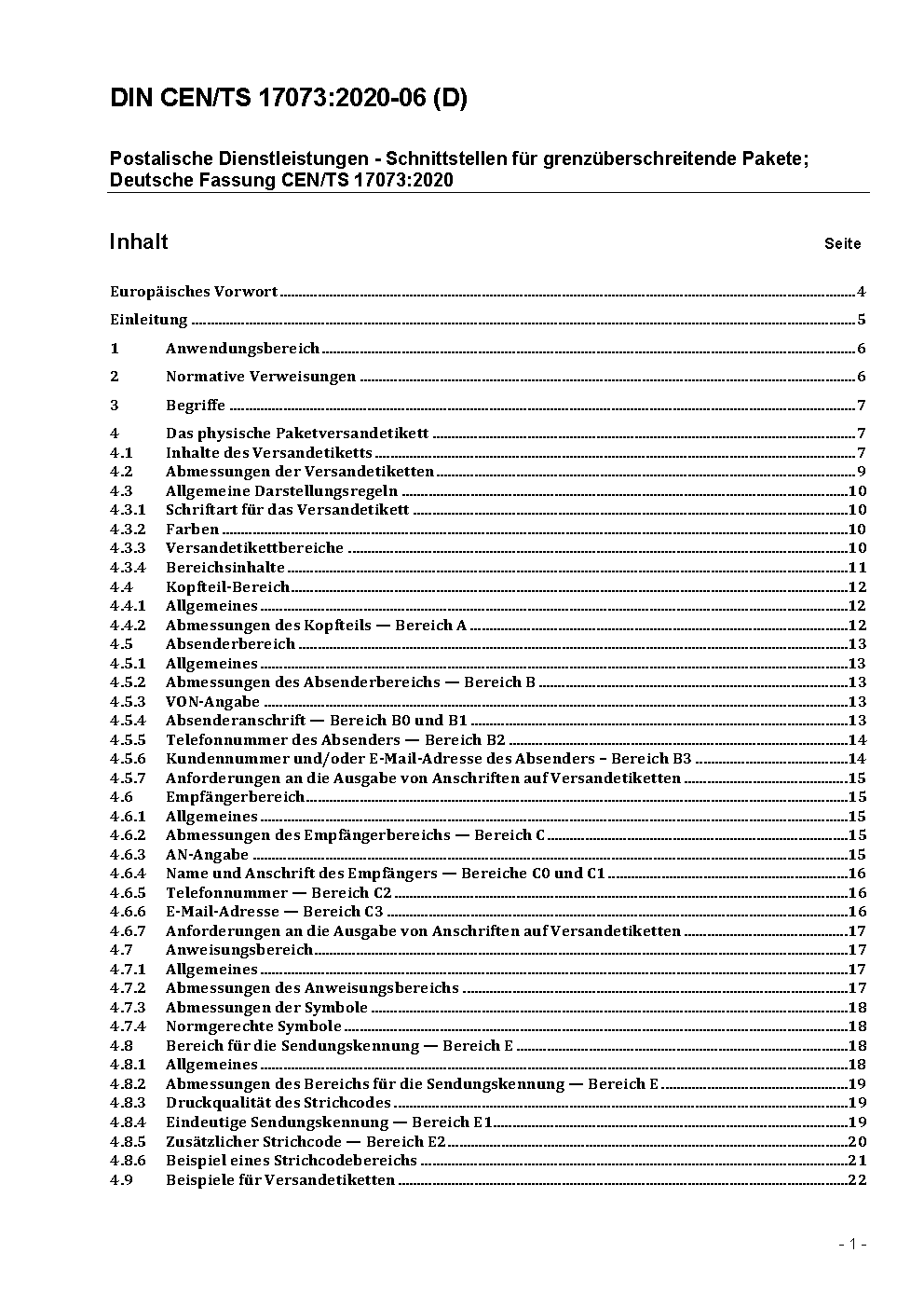 Postalische Dienstleistungen - Schnittstellen für grenzüberschreitende Pakete; Deutsche Fassung CEN/TS 17073:2020 + AC:2020