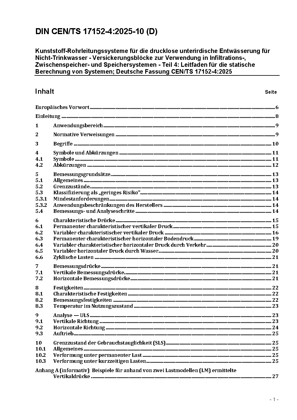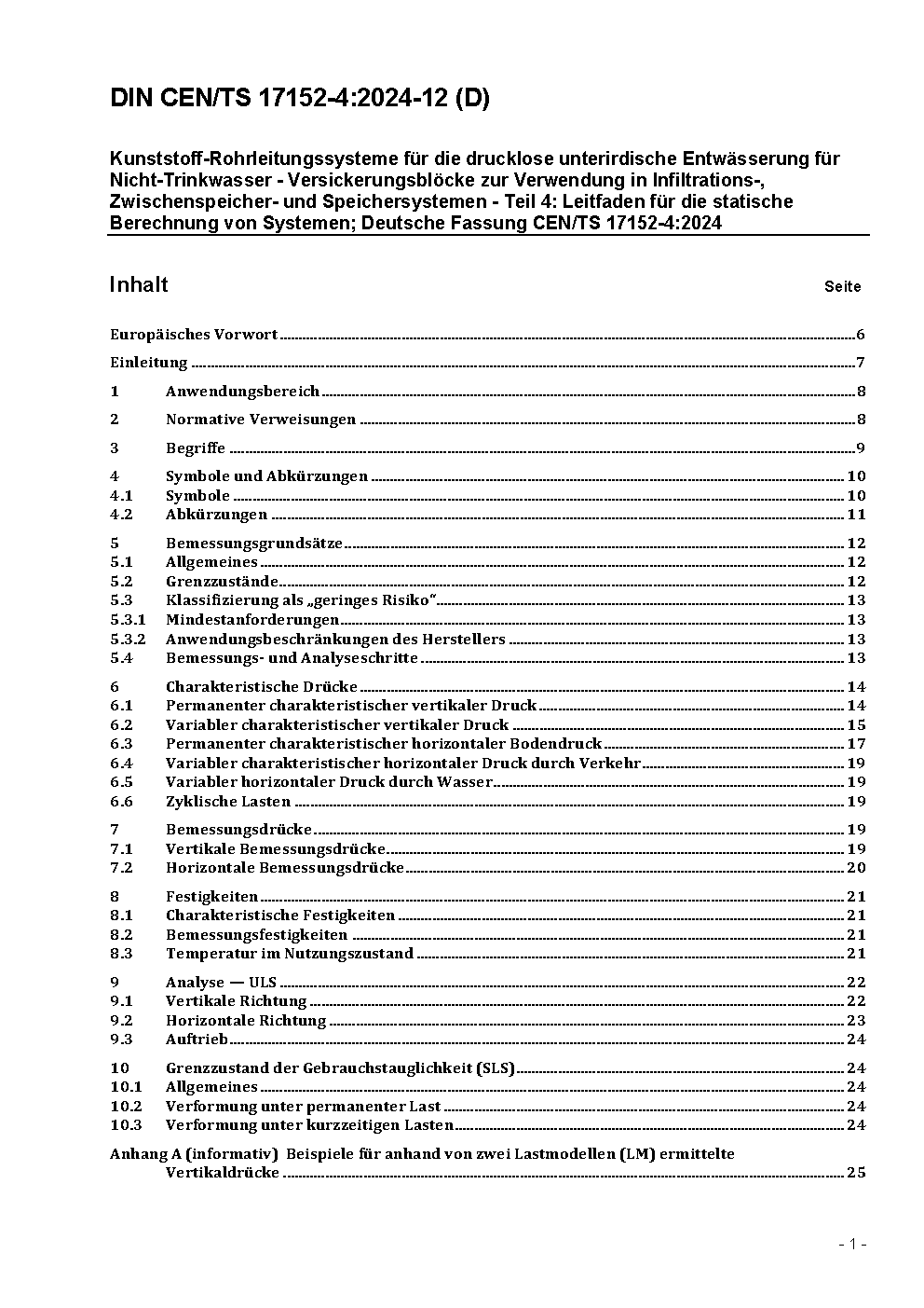 Kunststoff-Rohrleitungssysteme für die drucklose unterirdische Entwässerung für Nicht-Trinkwasser - Versickerungsblöcke zur Verwendung in Infiltrations-, Zwischenspeicher- und Speichersystemen - Teil 4: Leitfaden für die statische Berechnung von Systemen; Deutsche Fassung CEN/TS 17152-4:2024