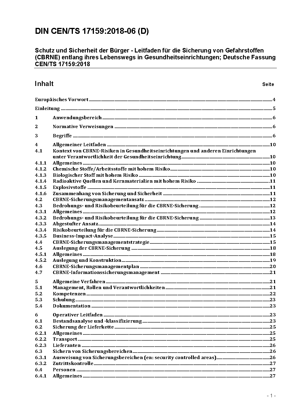 Schutz und Sicherheit der Bürger - Leitfaden für die Sicherung von Gefahrstoffen (CBRNE) entlang ihres Lebenswegs in Gesundheitseinrichtungen; Deutsche Fassung CEN/TS 17159:2018