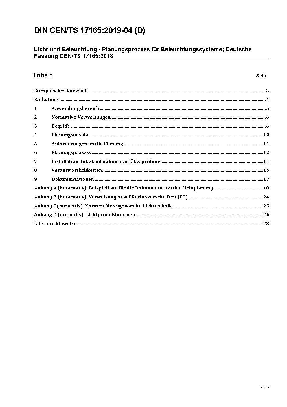 Licht und Beleuchtung - Planungsprozess für Beleuchtungssysteme; Deutsche Fassung CEN/TS 17165:2018