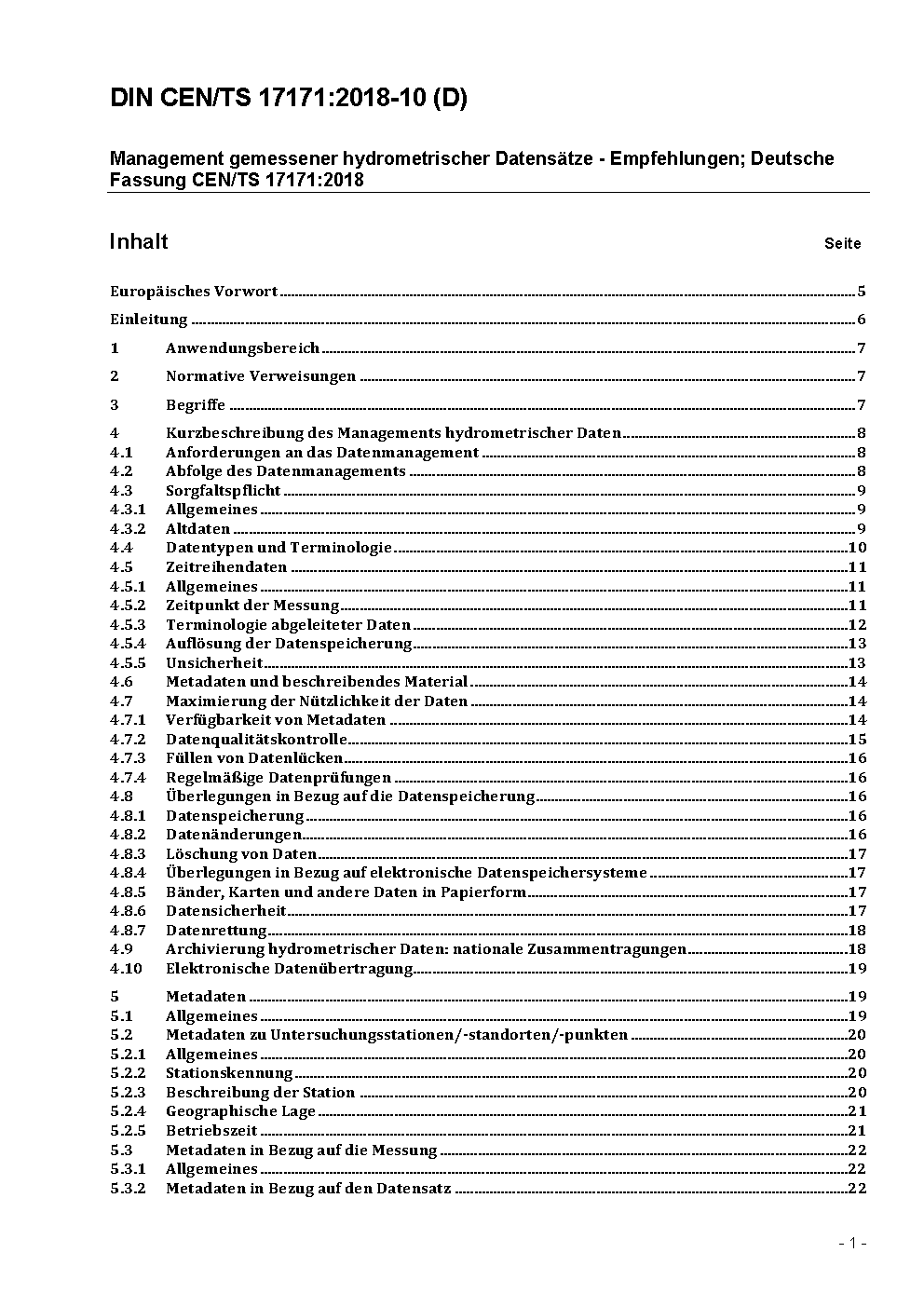 Management gemessener hydrometrischer Datensätze - Empfehlungen; Deutsche Fassung CEN/TS 17171:2018