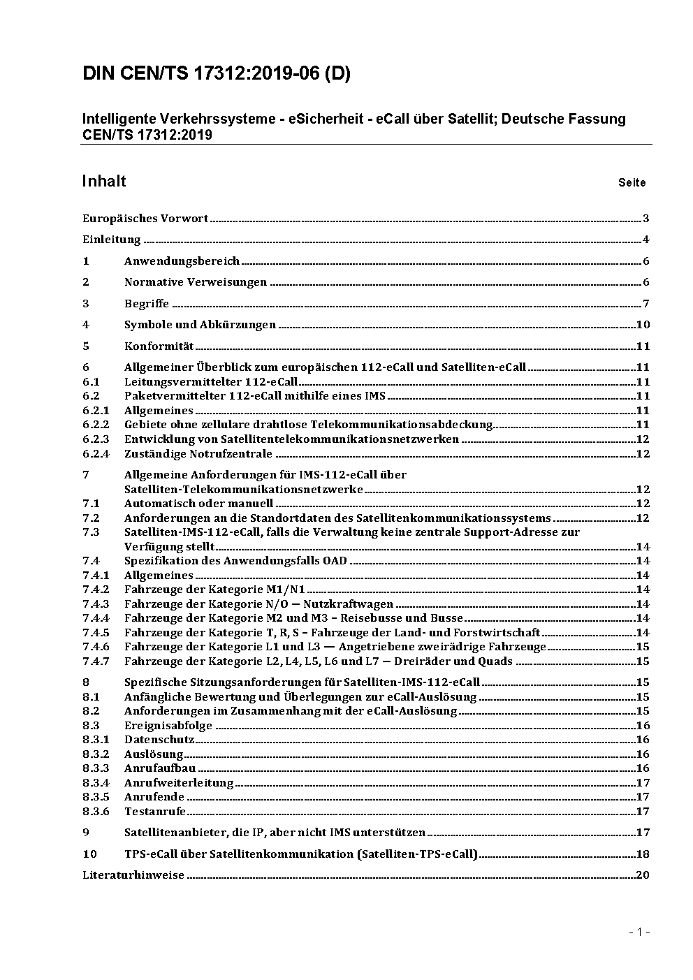 Intelligente Verkehrssysteme - eSicherheit - eCall über Satellit; Deutsche Fassung CEN/TS 17312:2019
