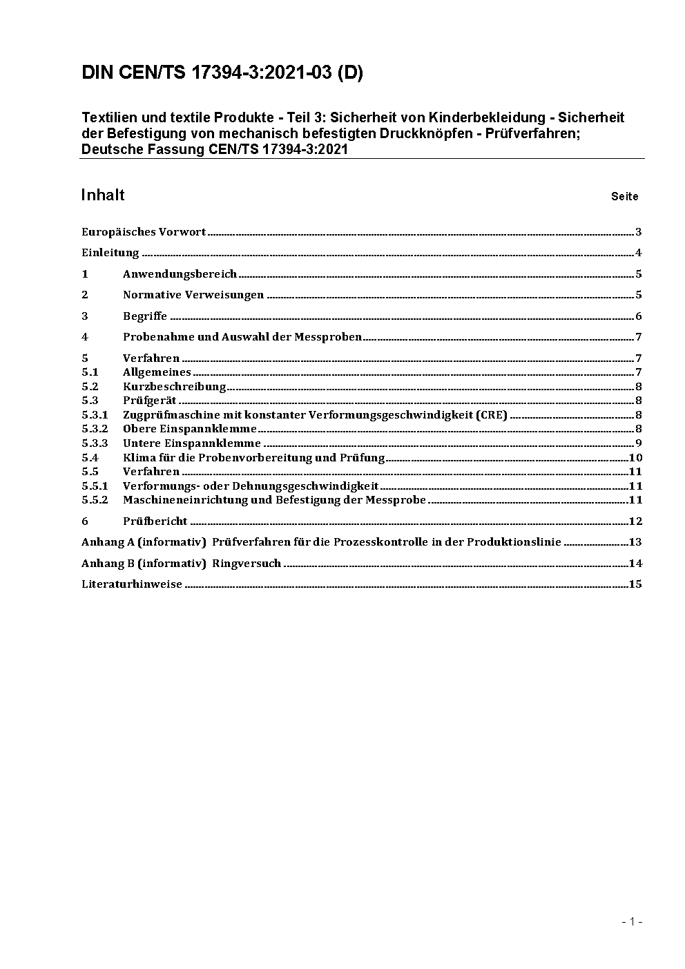 Textilien und textile Produkte - Teil 3: Sicherheit von Kinderbekleidung - Sicherheit der Befestigung von mechanisch befestigten Druckknöpfen - Prüfverfahren; Deutsche Fassung CEN/TS 17394-3:2021