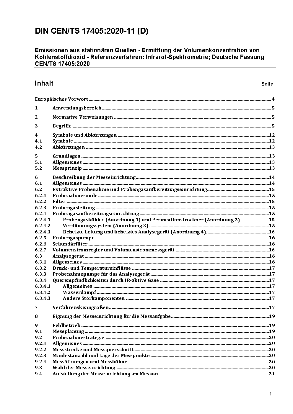 Emissionen aus stationären Quellen - Ermittlung der Volumenkonzentration von Kohlenstoffdioxid - Referenzverfahren: Infrarot-Spektrometrie; Deutsche Fassung CEN/TS 17405:2020