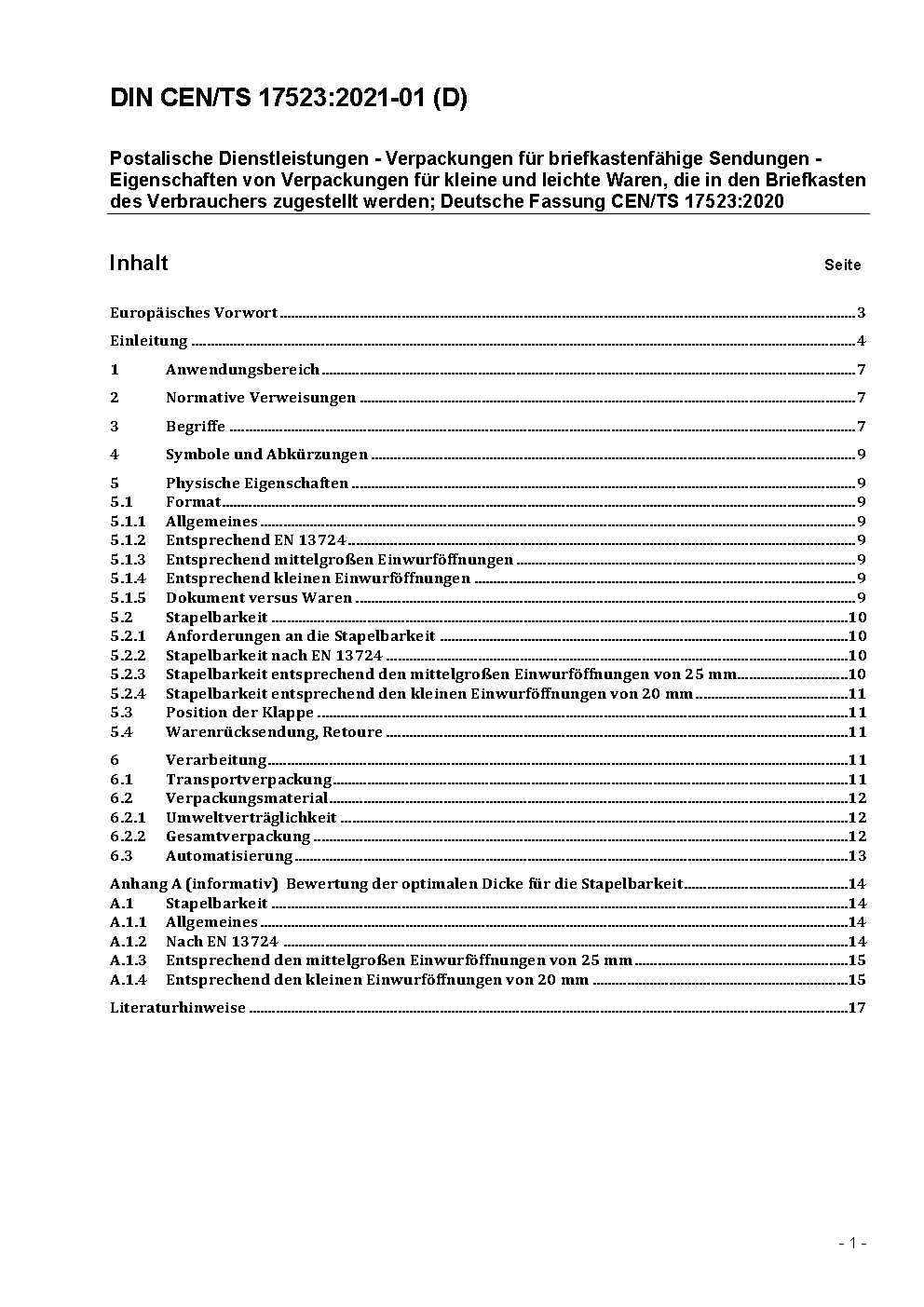 Postalische Dienstleistungen - Verpackungen für briefkastenfähige Sendungen - Eigenschaften von Verpackungen für kleine und leichte Waren, die in den Briefkasten des Verbrauchers zugestellt werden; Deutsche Fassung CEN/TS 17523:2020