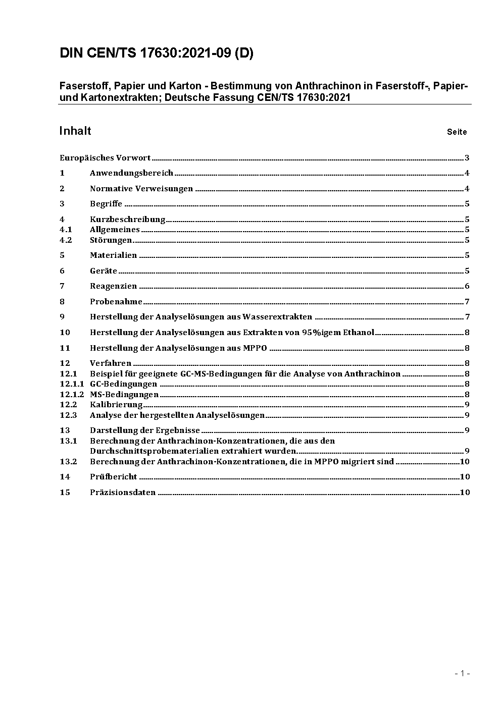 Faserstoff, Papier und Karton - Bestimmung von Anthrachinon in Faserstoff-, Papier- und Kartonextrakten; Deutsche Fassung CEN/TS 17630:2021