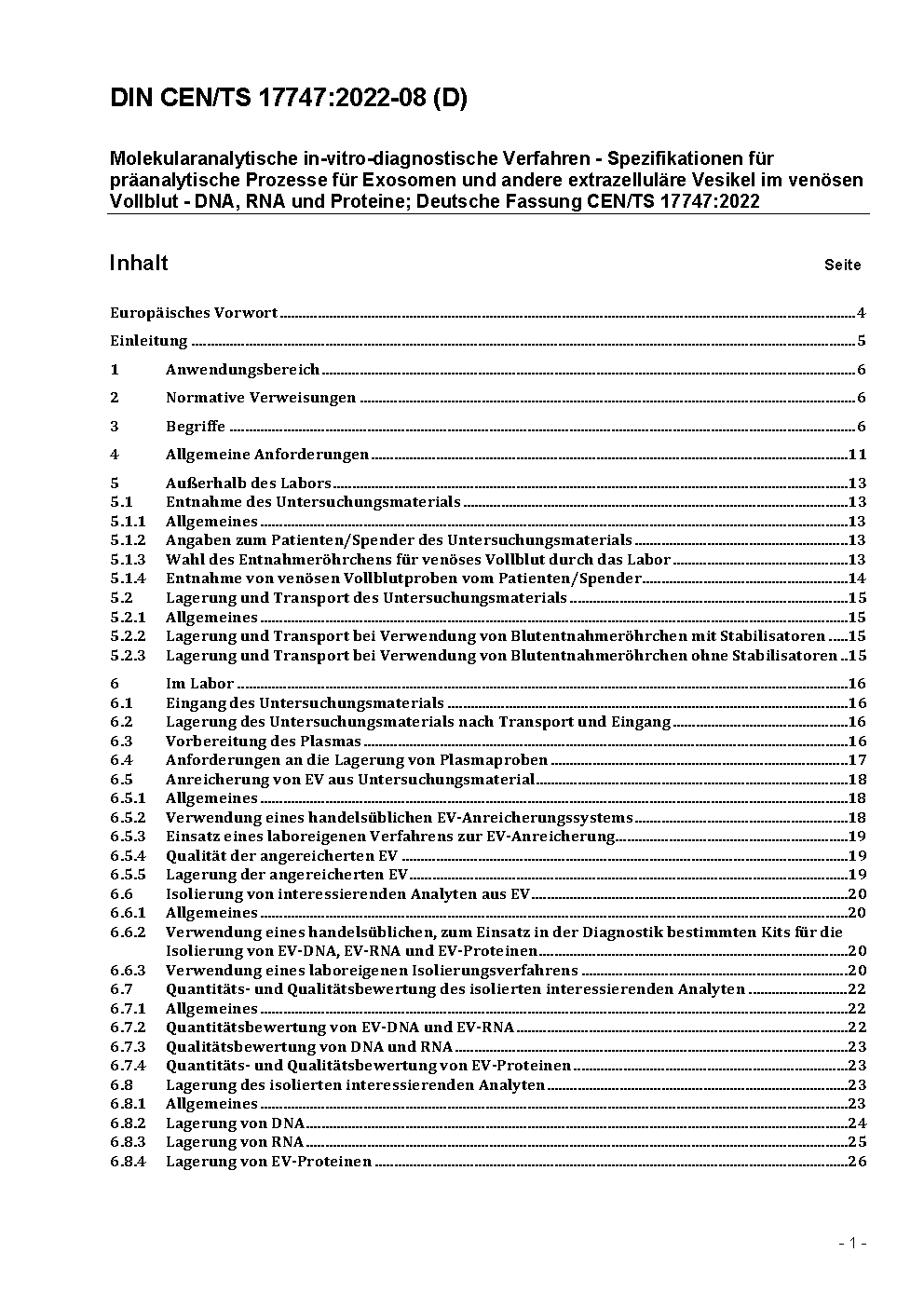 Molekularanalytische in-vitro-diagnostische Verfahren - Spezifikationen für präanalytische Prozesse für Exosomen und andere extrazelluläre Vesikel im venösen Vollblut - DNA, RNA und Proteine; Deutsche Fassung CEN/TS 17747:2022