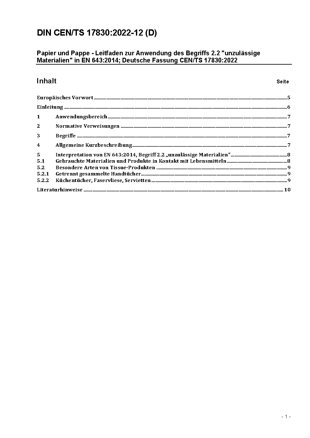 Paper and board - Guidance on the application of Term 2.2 "Prohibited materials" of EN 643:2014; German version CEN/TS 17830:2022