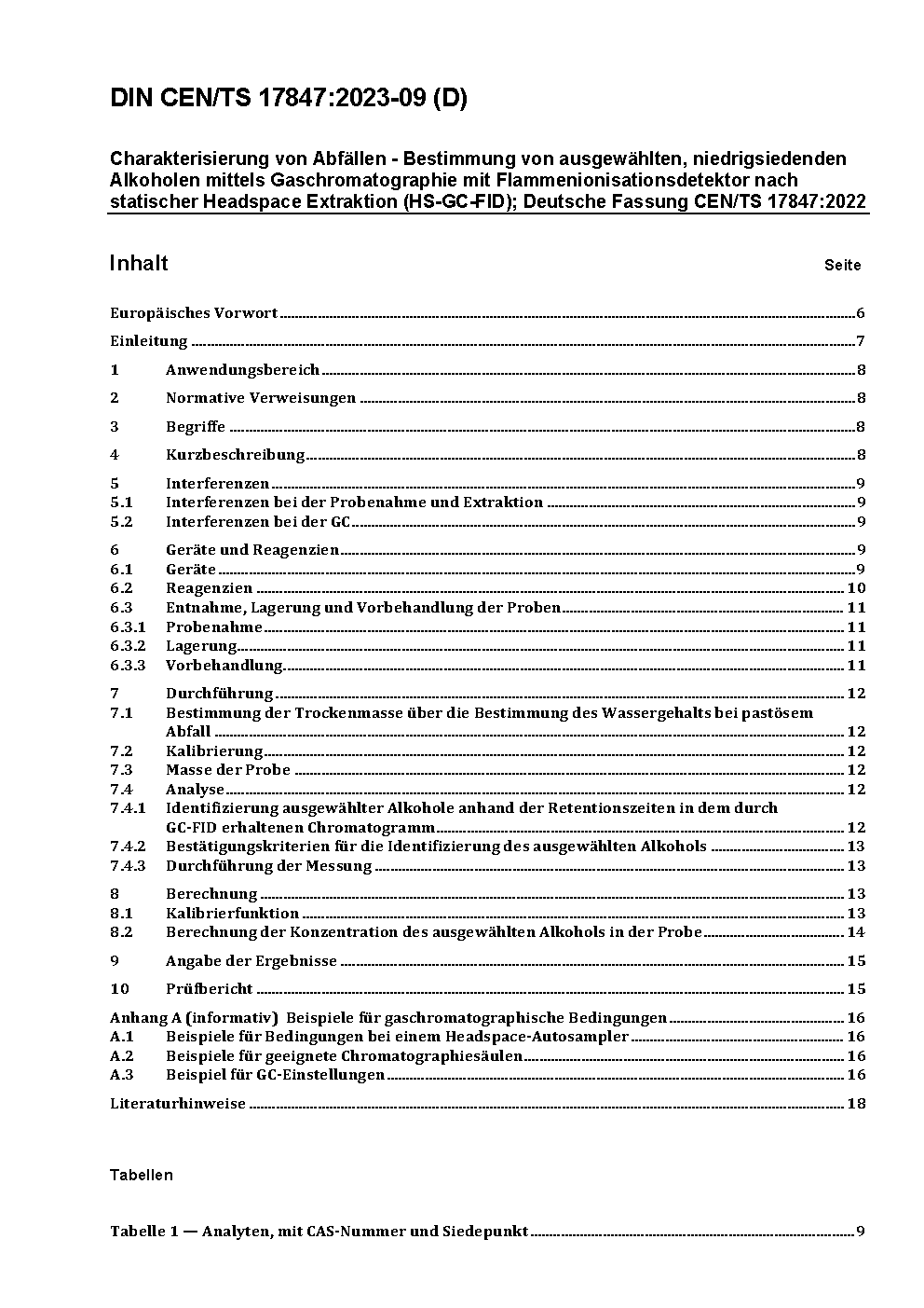 Charakterisierung von Abfällen - Bestimmung von ausgewählten, niedrigsiedenden Alkoholen mittels Gaschromatographie mit Flammenionisationsdetektor nach statischer Headspace Extraktion (HS-GC-FID); Deutsche Fassung CEN/TS 17847:2022