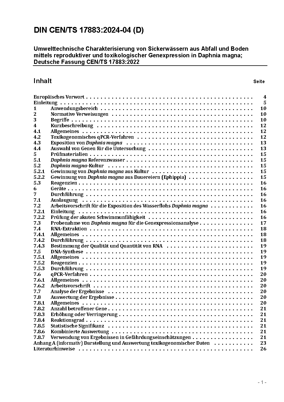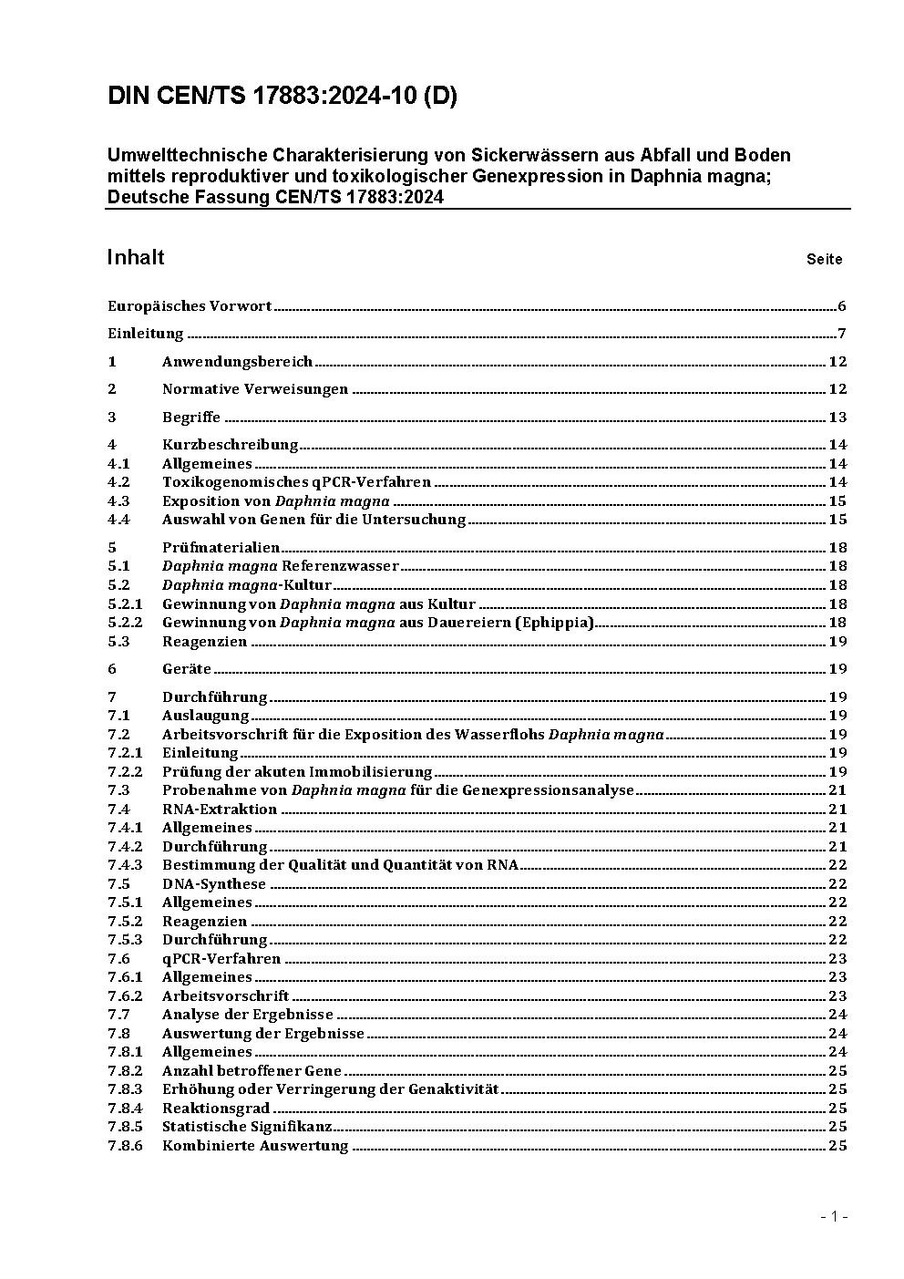 Umwelttechnische Charakterisierung von Sickerwässern aus Abfall und Boden mittels reproduktiver und toxikologischer Genexpression in Daphnia magna; Deutsche Fassung CEN/TS 17883:2024