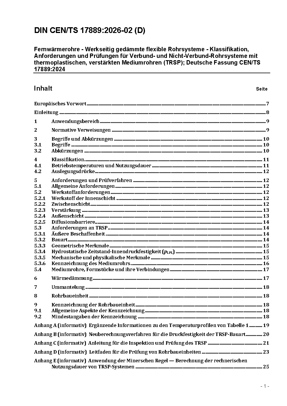 Fernwärmerohre - Werkseitig gedämmte flexible Rohrsysteme - Klassifikation, Anforderungen und Prüfungen für Verbund- und Nicht-Verbund-Rohrsysteme mit thermoplastischen, verstärkten Mediumrohren (TRSP); Deutsche Fassung CEN/TS 17889:2024