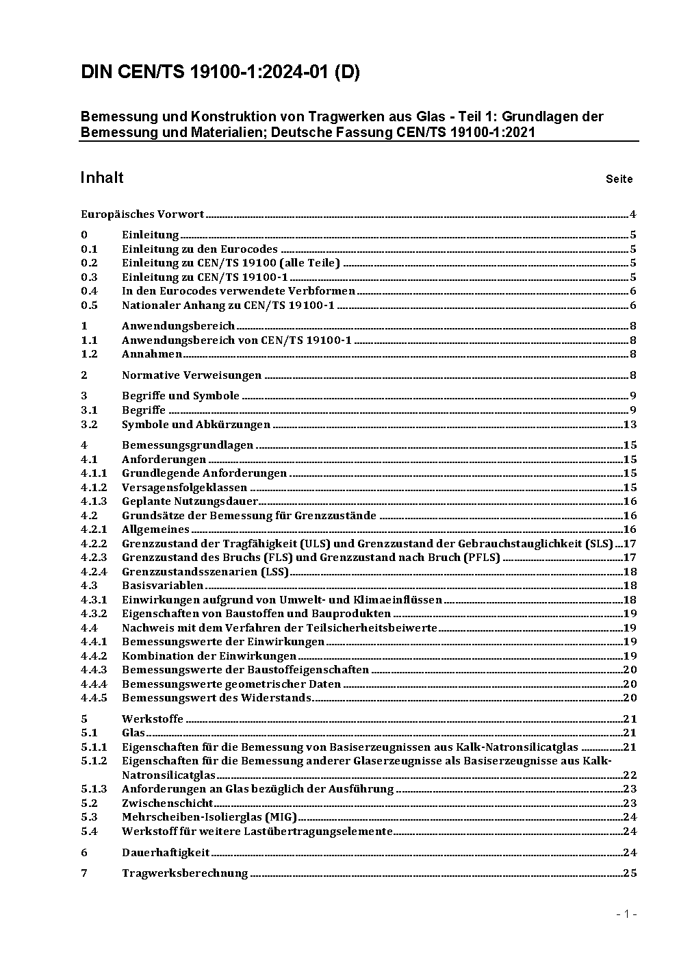 Design of glass structures - Part 1: Basis of design and materials; German version CEN/TS 19100-1:2021