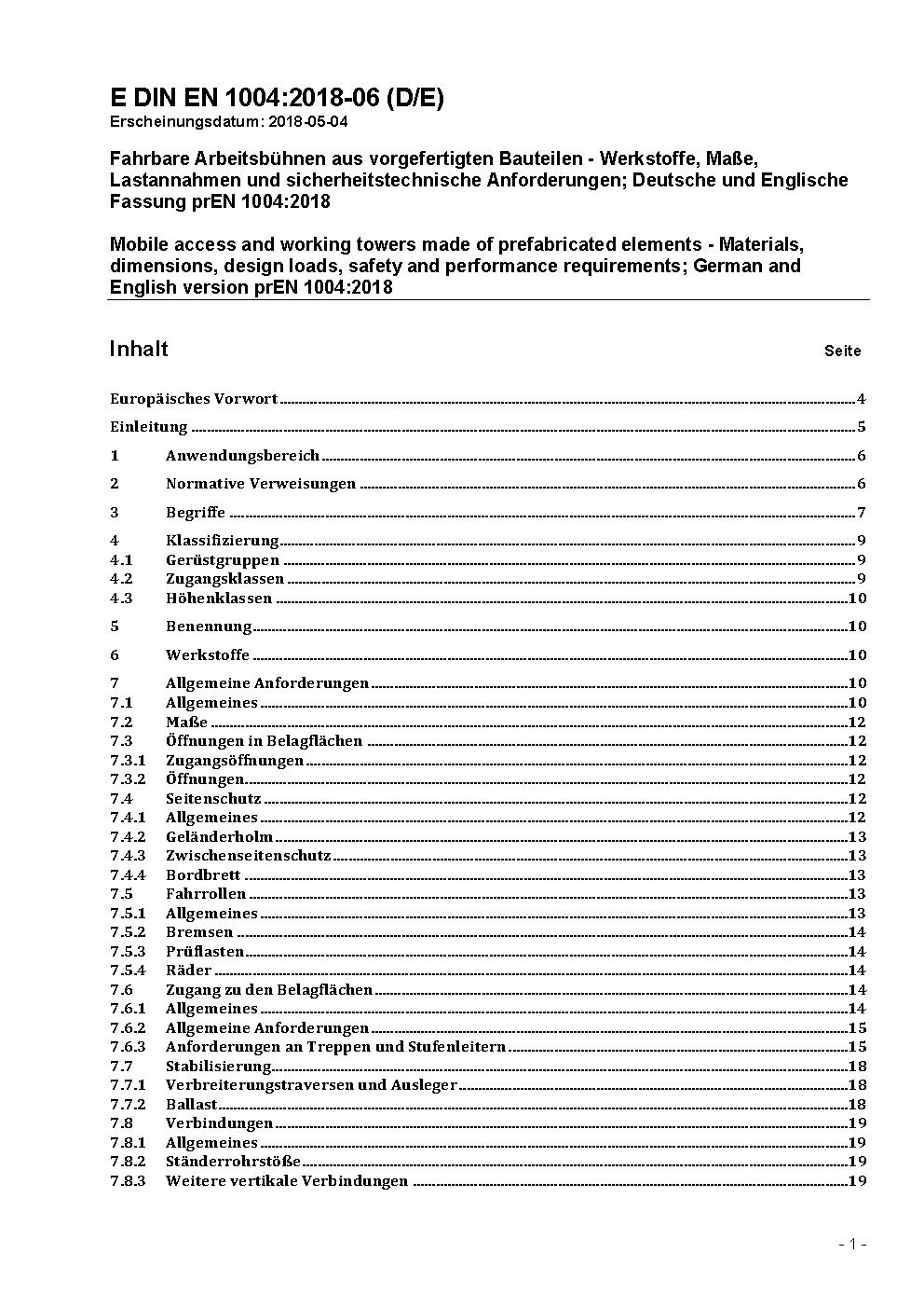 Fahrbare Arbeitsbühnen aus vorgefertigten Bauteilen - Werkstoffe, Maße, Lastannahmen und sicherheitstechnische Anforderungen; Deutsche und Englische Fassung prEN 1004:2018