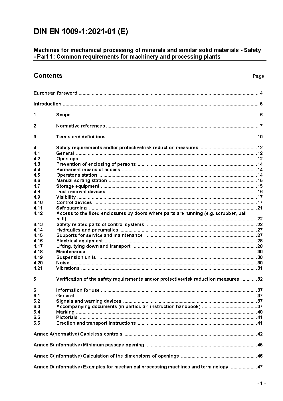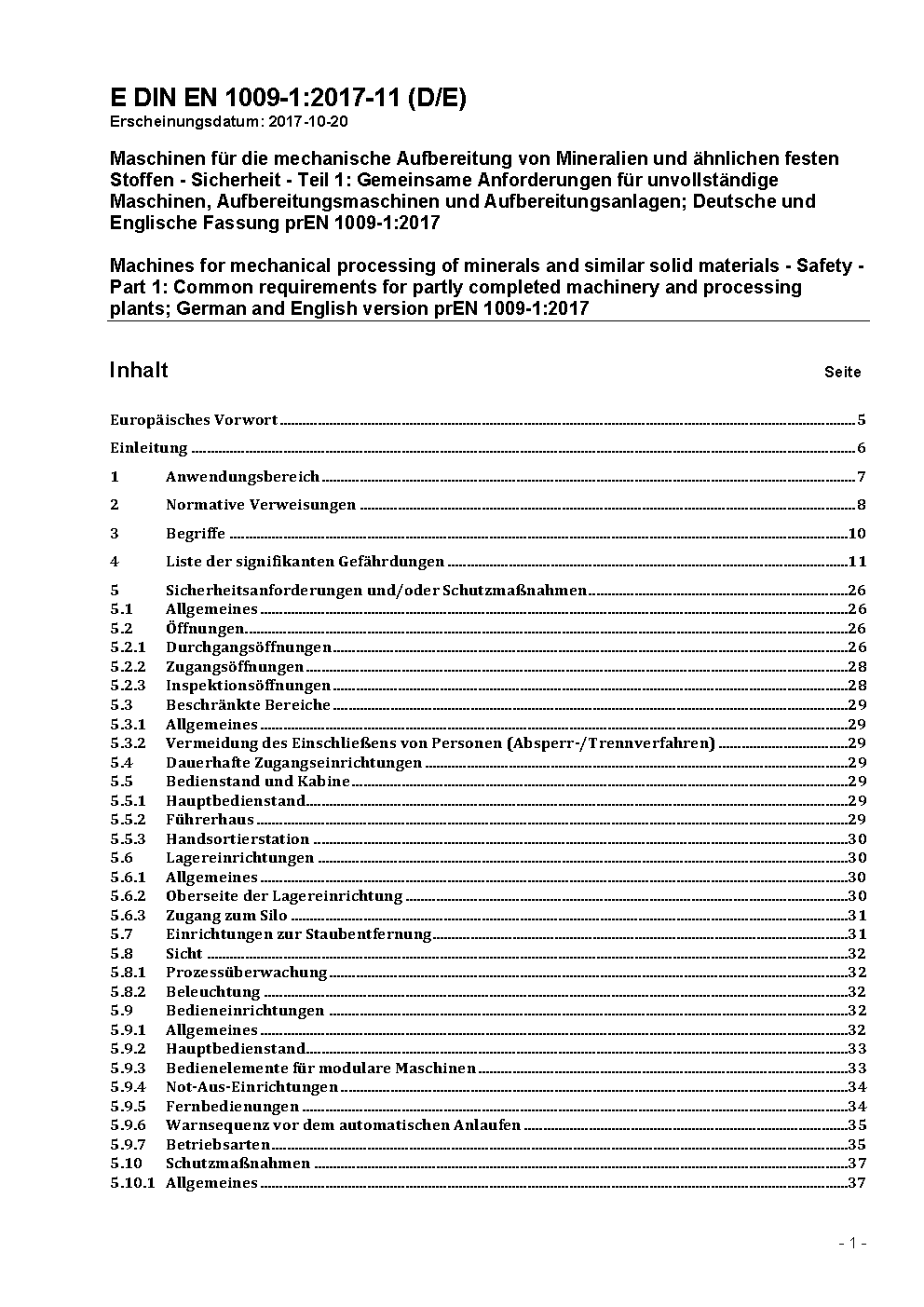 Machines for mechanical processing of minerals and similar solid materials - Safety - Part 1: Common requirements for machinery and processing plants; German and English version EN 1009-1:2020/prA1:2023