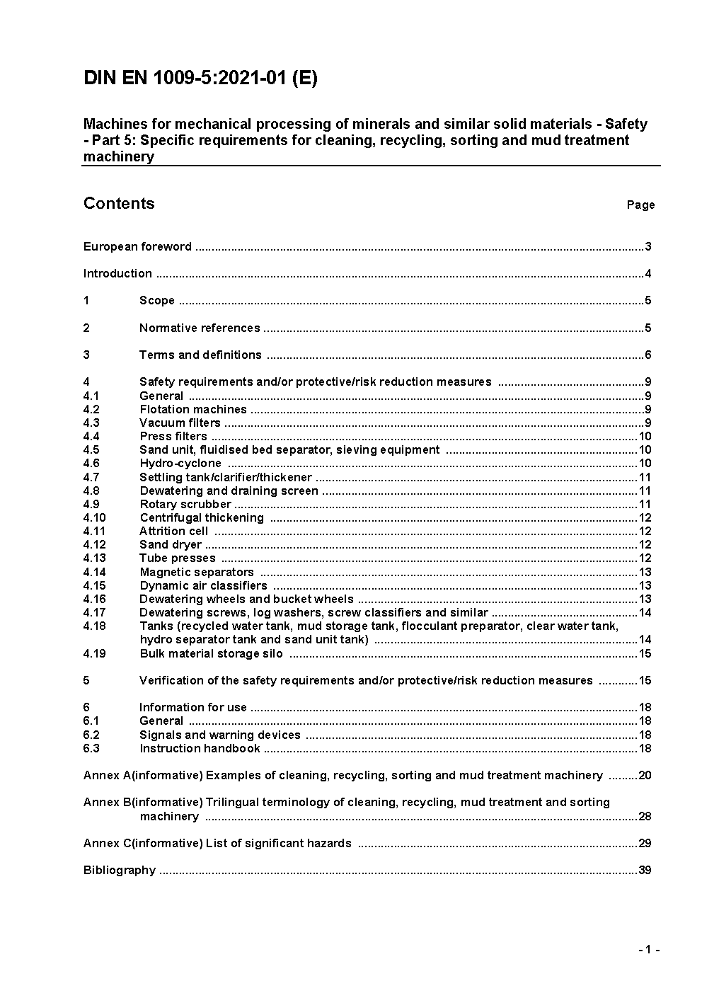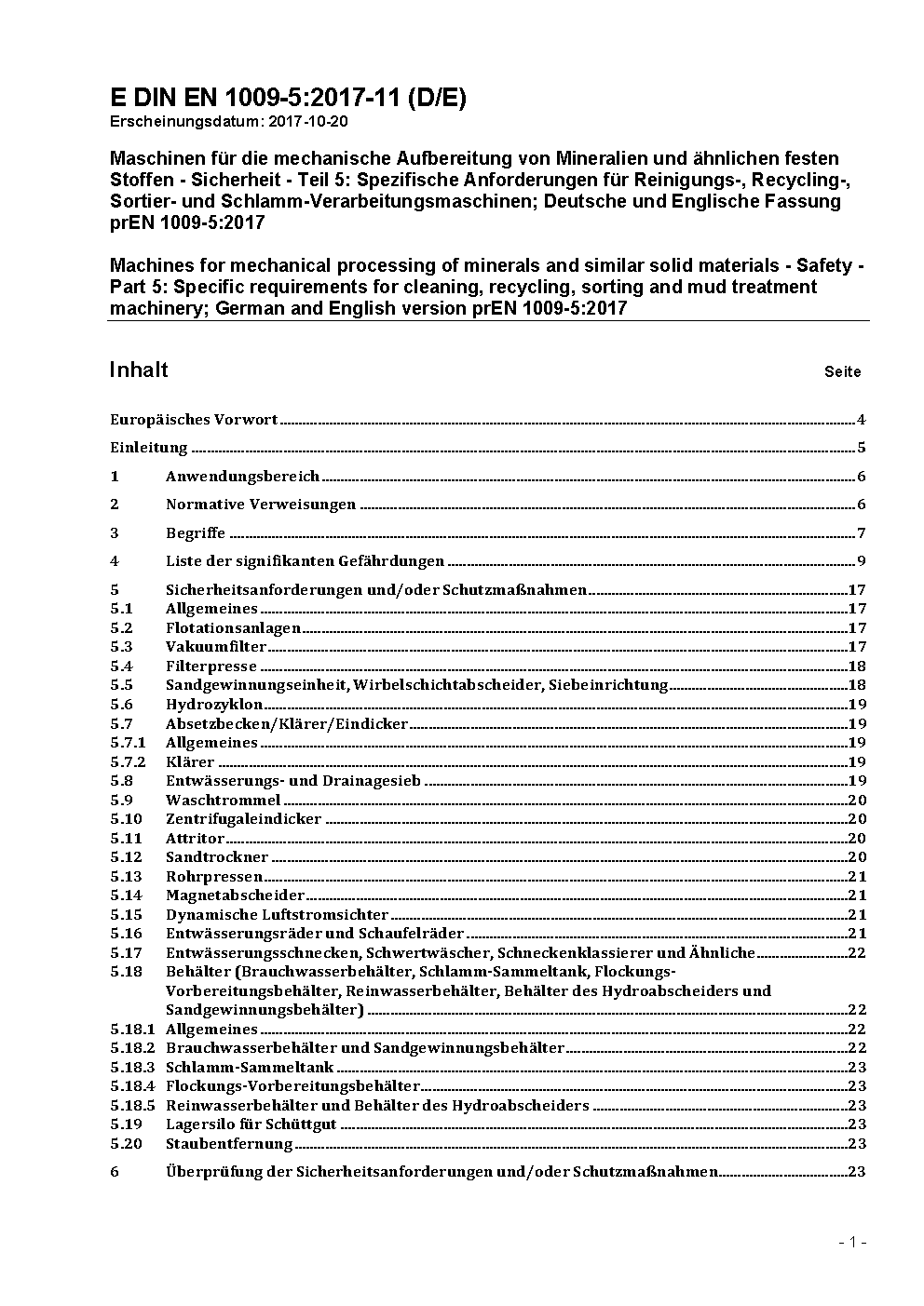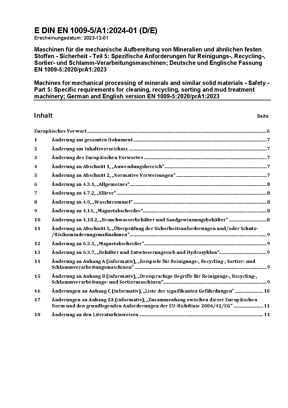 Machines for mechanical processing of minerals and similar solid materials - Safety - Part 5: Specific requirements for cleaning, recycling, sorting and mud treatment machinery; German and English version EN 1009-5:2020/prA1:2023