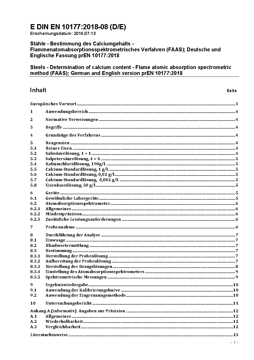 Stähle - Bestimmung des Calciumgehalts - Flammenatomabsorptionsspektrometrisches Verfahren (FAAS); Deutsche und Englische Fassung prEN 10177:2018