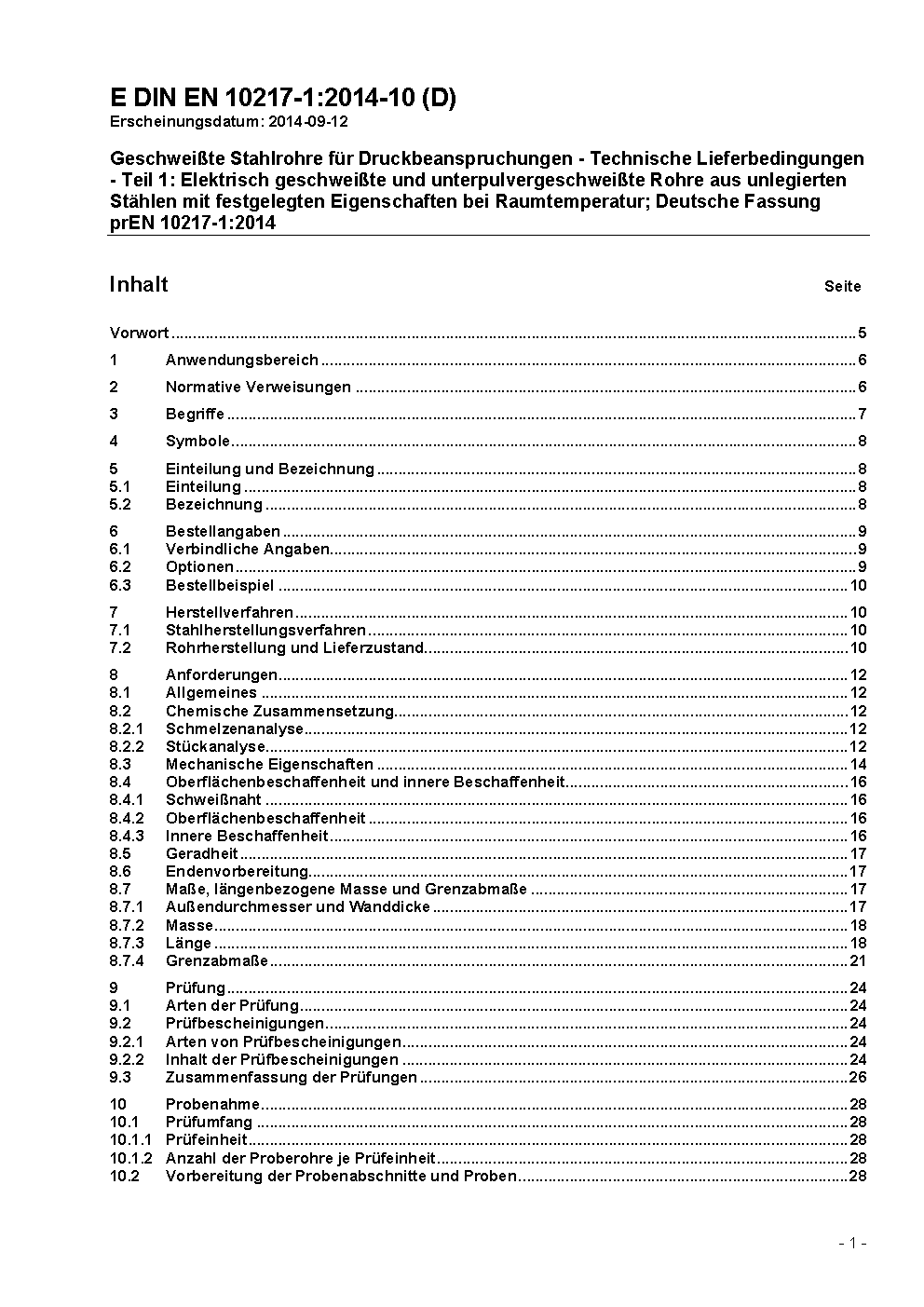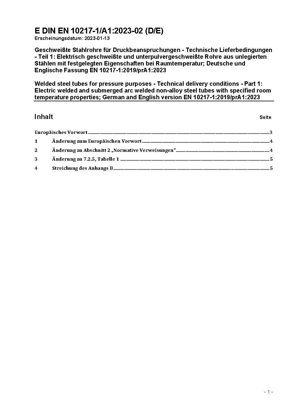 Geschweißte Stahlrohre für Druckbeanspruchungen - Technische Lieferbedingungen - Teil 1: Elektrisch geschweißte und unterpulvergeschweißte Rohre aus unlegierten Stählen mit festgelegten Eigenschaften bei Raumtemperatur; Deutsche Fassung EN 10217-1:2019