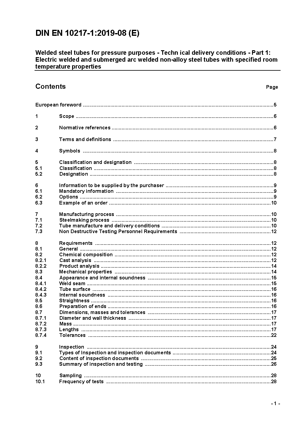Welded steel tubes for pressure purposes - Technical delivery conditions - Part 1: Electric welded and submerged arc welded non-alloy steel tubes with specified room temperature properties; German version EN 10217-1:2019