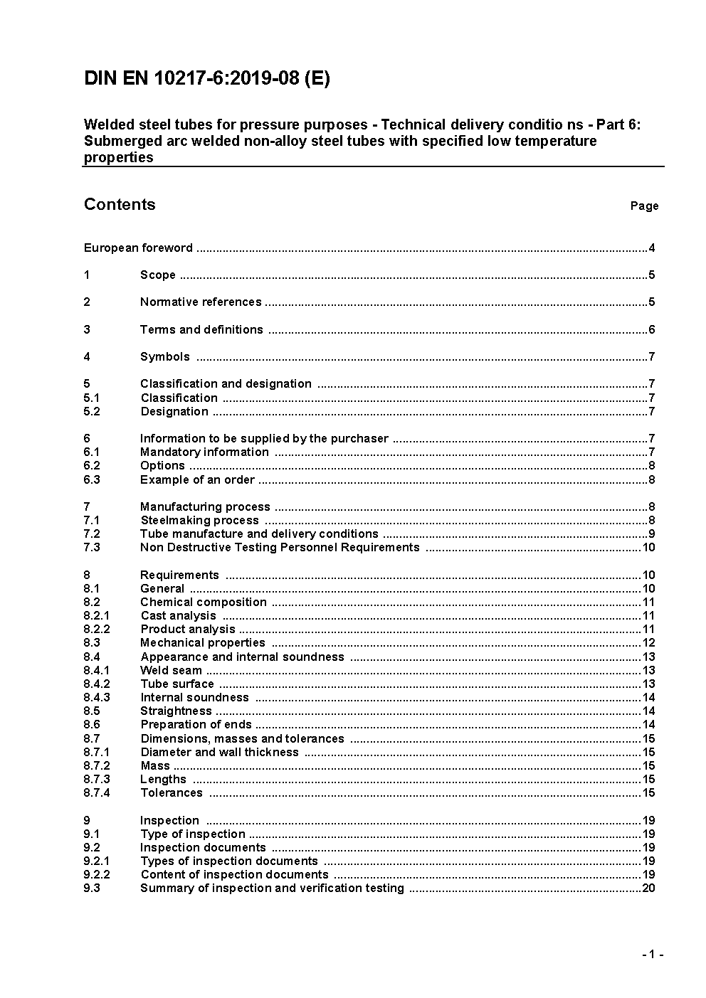 Welded steel tubes for pressure purposes - Technical delivery conditions - Part 6: Submerged arc welded non-alloy steel tubes with specified low temperature properties; German version EN 10217-6:2019