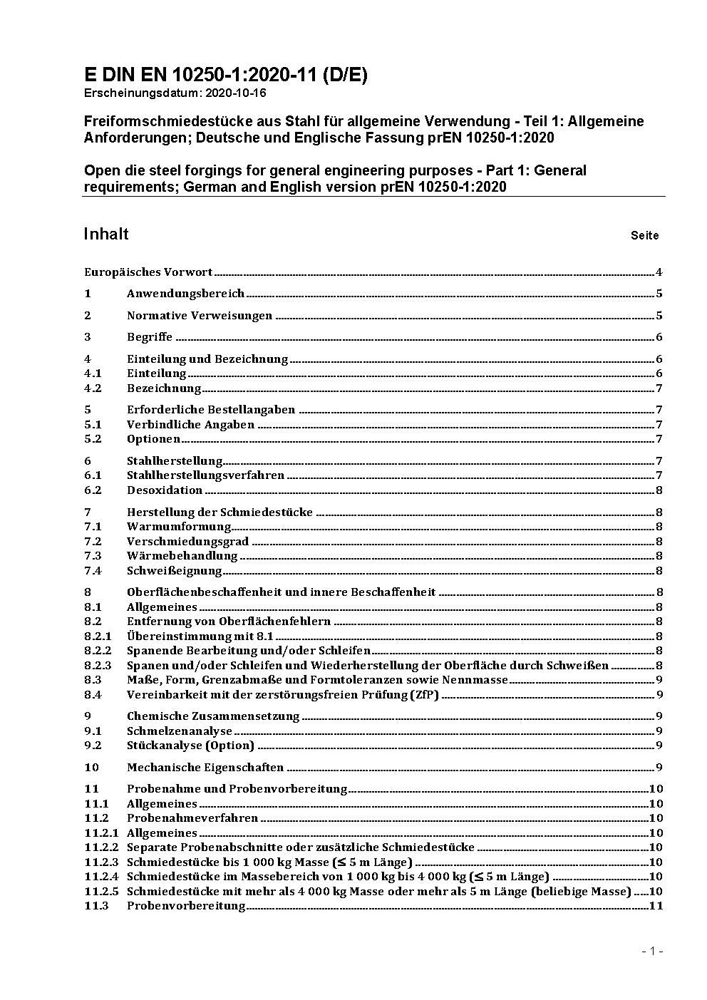 Freiformschmiedestücke aus Stahl für allgemeine Verwendung - Teil 1: Allgemeine Anforderungen; Deutsche Fassung EN 10250-1:2022