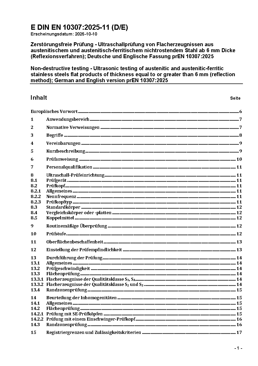 Zerstörungsfreie Prüfung - Ultraschallprüfung von Flacherzeugnissen aus austenitischem und austenitisch-ferritischem nichtrostendem Stahl ab 6 mm Dicke (Reflexionsverfahren); Deutsche Fassung EN 10307:2001