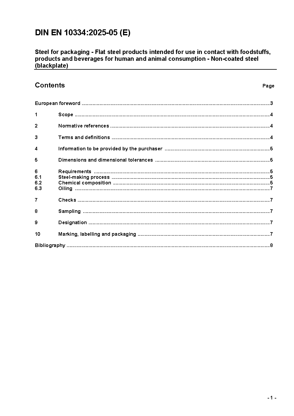 Steel for packaging - Flat steel products intended for use in contact with foodstuffs, products and beverages for human and animal consumption - Non-coated steel (blackplate); German and English version prEN 10334:2023