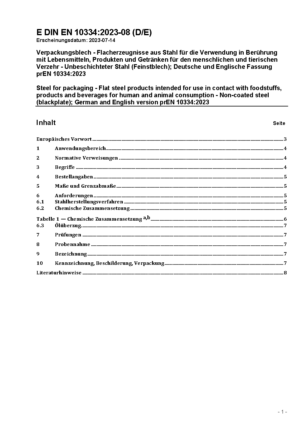Verpackungsblech - Flacherzeugnisse aus Stahl für die Verwendung in Berührung mit Lebensmitteln, Produkten und Getränken für den menschlichen und tierischen Verzehr - Unbeschichteter Stahl (Feinstblech); Deutsche und Englische Fassung prEN 10334:2023