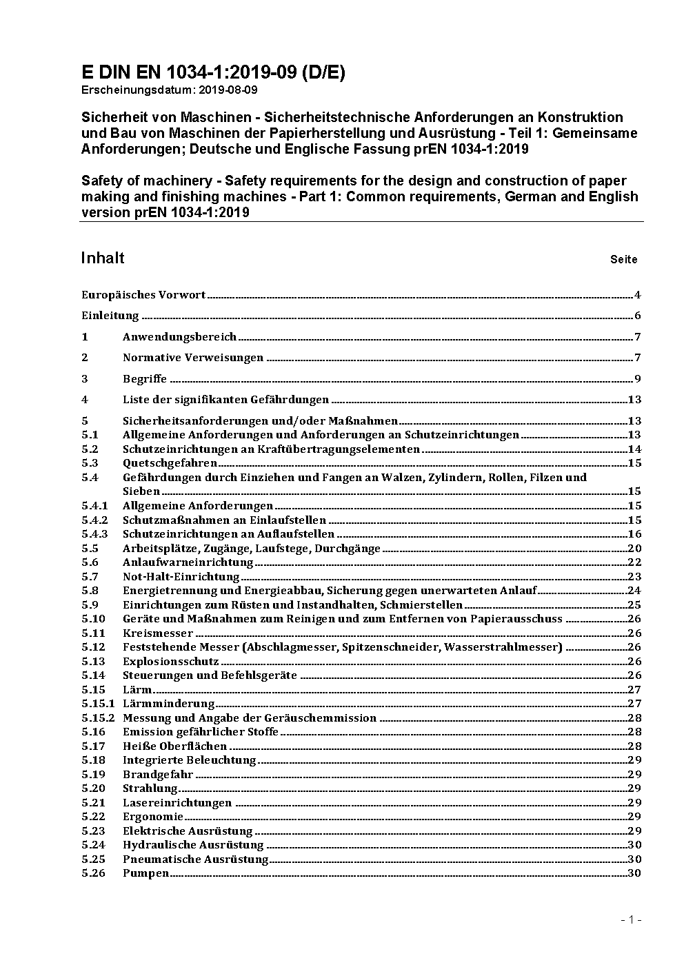 Sicherheit von Maschinen - Sicherheitstechnische Anforderungen an Konstruktion und Bau von Maschinen der Papierherstellung und Ausrüstung - Teil 1: Gemeinsame Anforderungen; Deutsche und Englische Fassung prEN 1034-1:2019