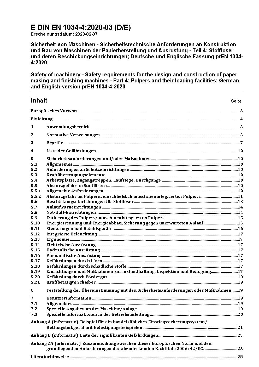 Sicherheit von Maschinen - Sicherheitstechnische Anforderungen an Konstruktion und Bau von Maschinen der Papierherstellung und Ausrüstung - Teil 4: Stofflöser und deren Beschickungseinrichtungen; Deutsche und Englische Fassung prEN 1034-4:2020