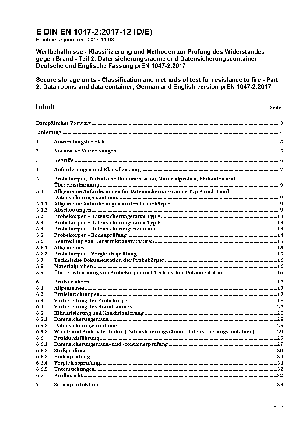 Wertbehältnisse - Klassifizierung und Methoden zur Prüfung des Widerstandes gegen Brand - Teil 2: Datensicherungsräume und Datensicherungscontainer; Deutsche Fassung prEN 1047-2:1995