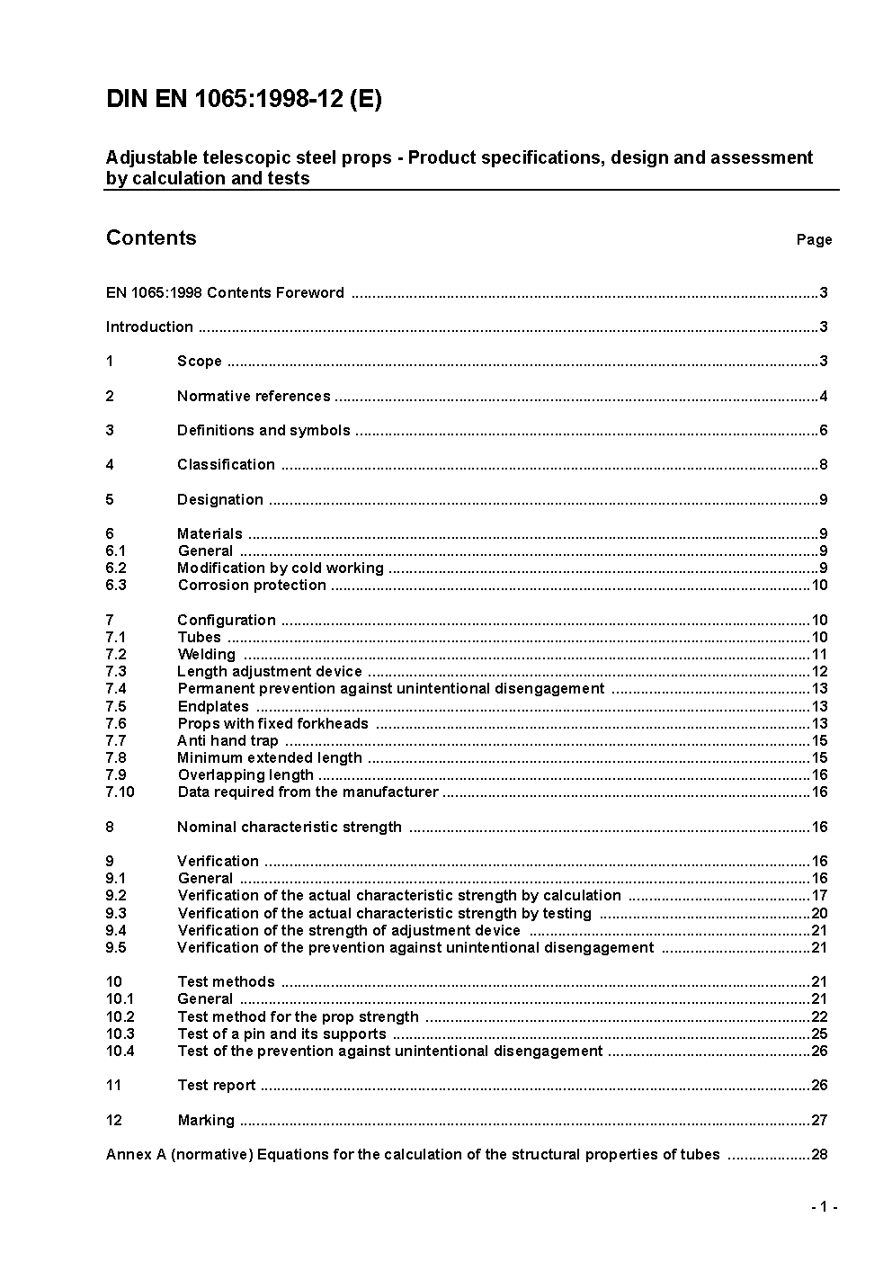 Adjustable telescopic steel props - Product specifications, design and assessment by calculation and tests; German version EN 1065:1998