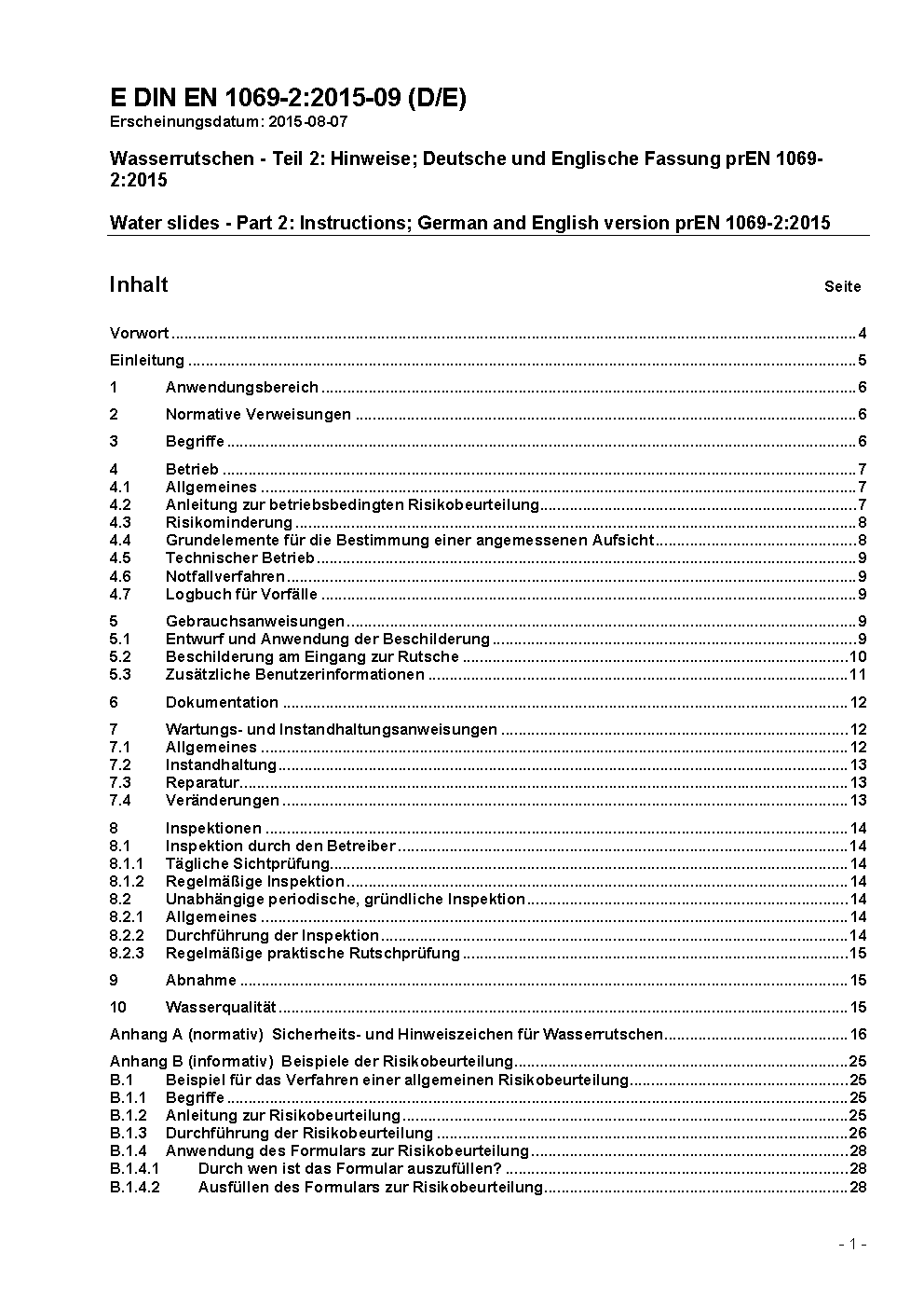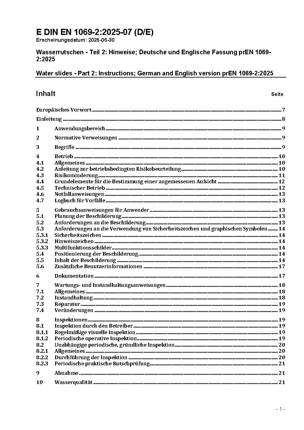 Wasserrutschen ab 2 m Höhe - Teil 2: Hinweise; Deutsche Fassung EN 1069-2:1999 / Achtung: Übergangsfrist, festgelegt durch DIN EN 1069-2 (2010-12), bis 2011-08-31 beachten.