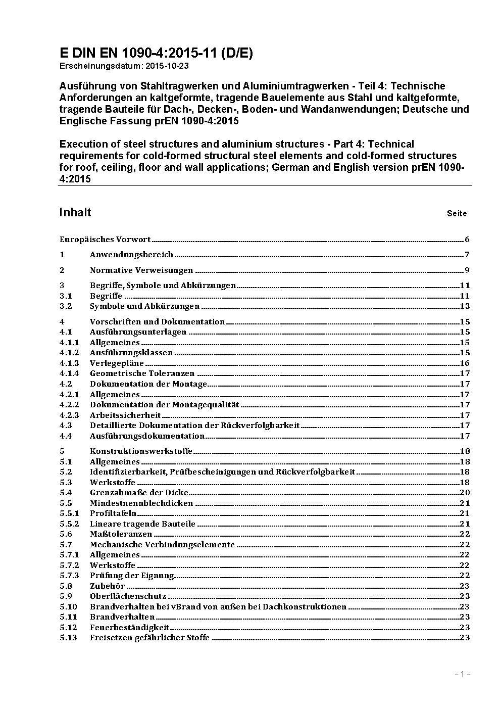Ausführung von Stahltragwerken und Aluminiumtragwerken - Teil 4: Technische Anforderungen an kaltgeformte, tragende Bauelemente aus Stahl und kaltgeformte, tragende Bauteile für Dach-, Decken-, Boden- und Wandanwendungen; Deutsche und Englische Fassung prEN 1090-4:2015