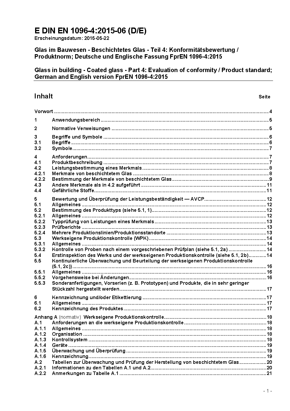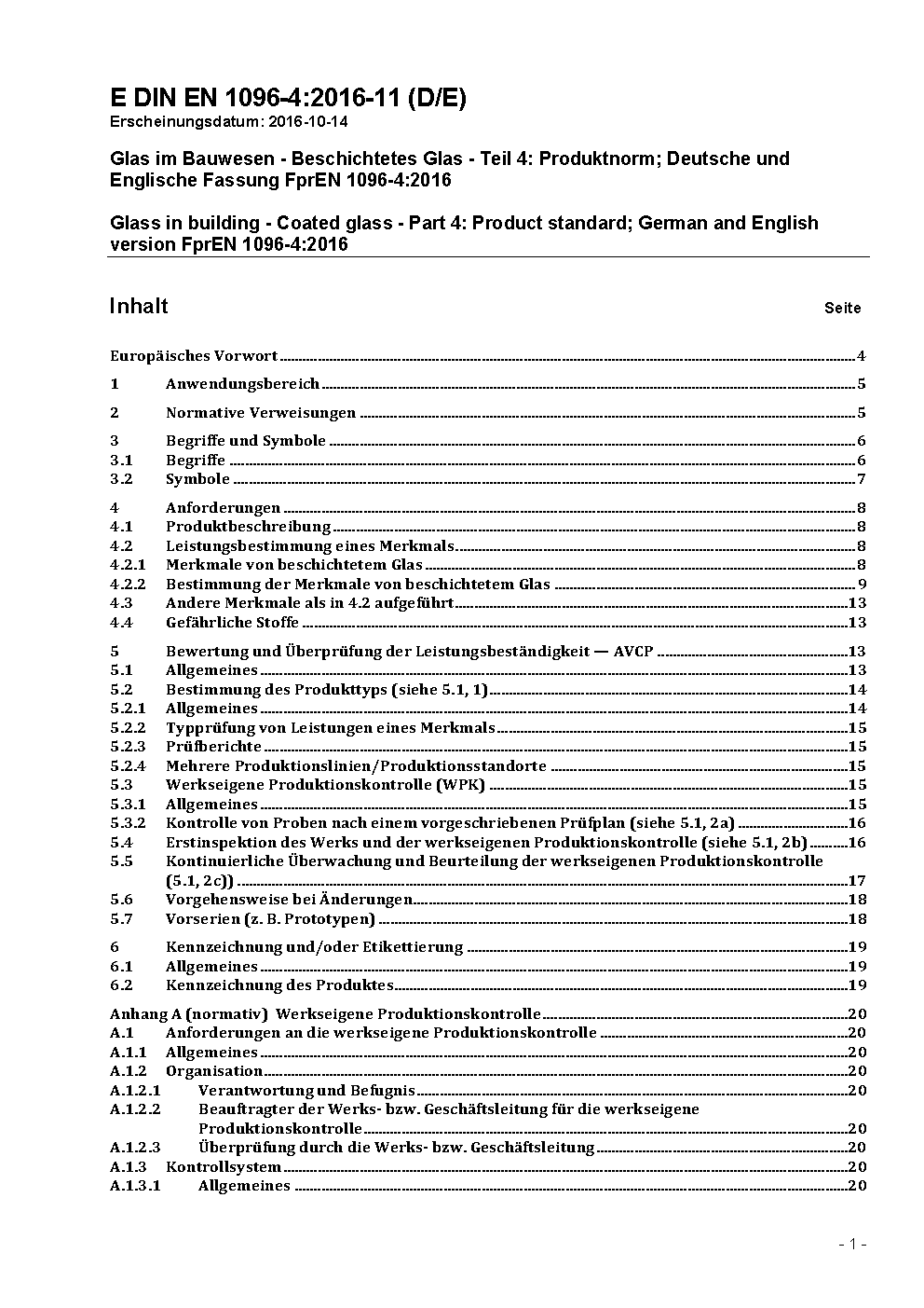 Glass in building - Coated glass - Part 4: Product standard; German version EN 1096-4:2018.