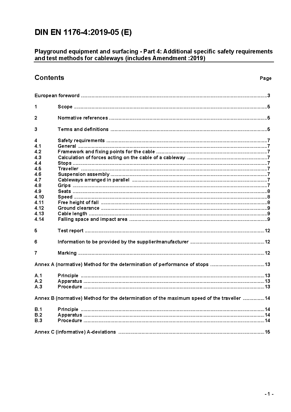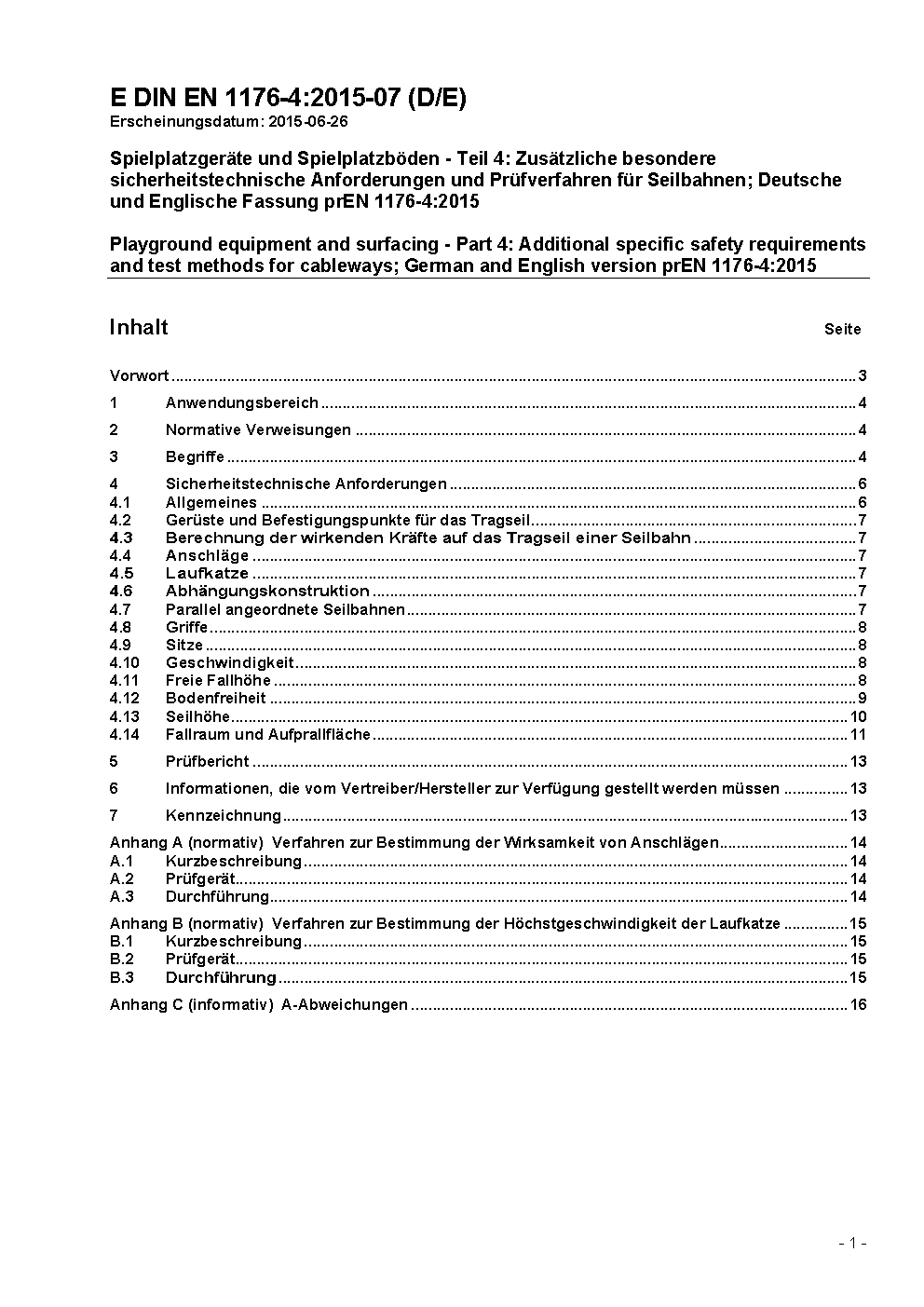 Spielplatzgeräte und Spielplatzböden - Teil 4: Zusätzliche besondere sicherheitstechnische Anforderungen und Prüfverfahren für Seilbahnen; Deutsche Fassung EN 1176-4:2008 / Achtung: Daneben gilt DIN EN 1176-4 (2008-08) noch bis 2009-05-31.*Übergangsfrist, festgelegt durch DIN EN 1176-4 (2017-12) und DIN EN 1176-4 (2019-05), bis 2018-10-31 beachten.