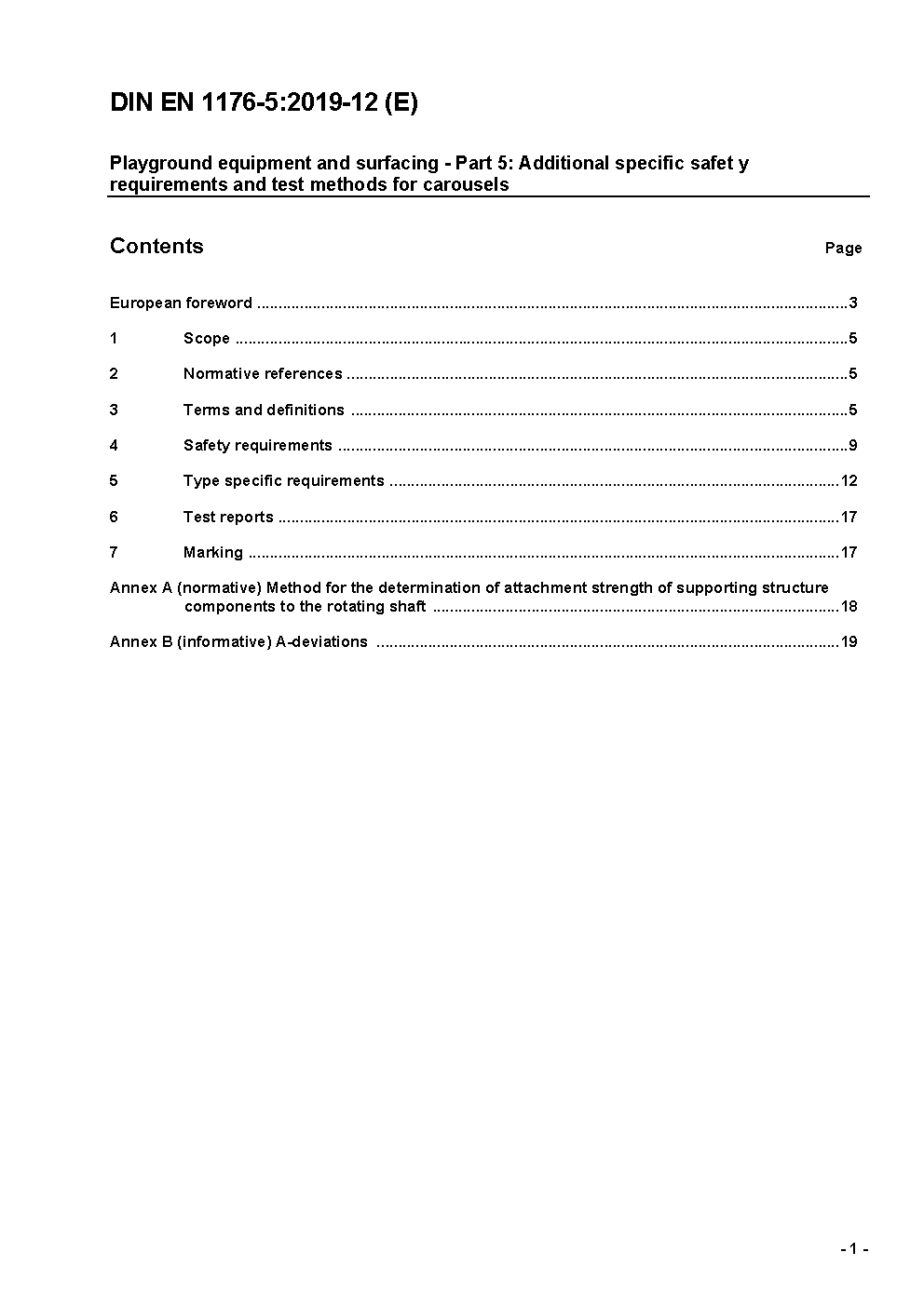 Spielplatzgeräte und Spielplatzböden - Teil 5: Zusätzliche besondere sicherheitstechnische Anforderungen und Prüfverfahren für Karussells; Deutsche Fassung EN 1176-5:2008 / Achtung: Daneben gilt DIN EN 1176-5 (2003-07) noch bis 2009-05-31.*Übergangsfrist, festgelegt durch DIN EN 1176-5 (2019-12), bis 2020-04-30 beachten.