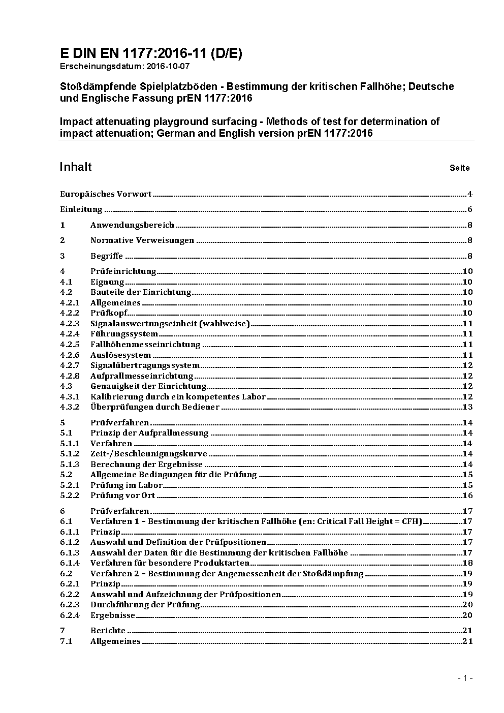 Impact attenuating playground surfacing - Determination of critical fall height; German version EN 1177:2008.