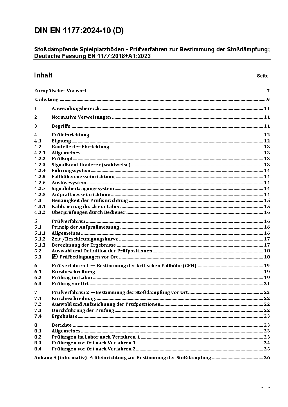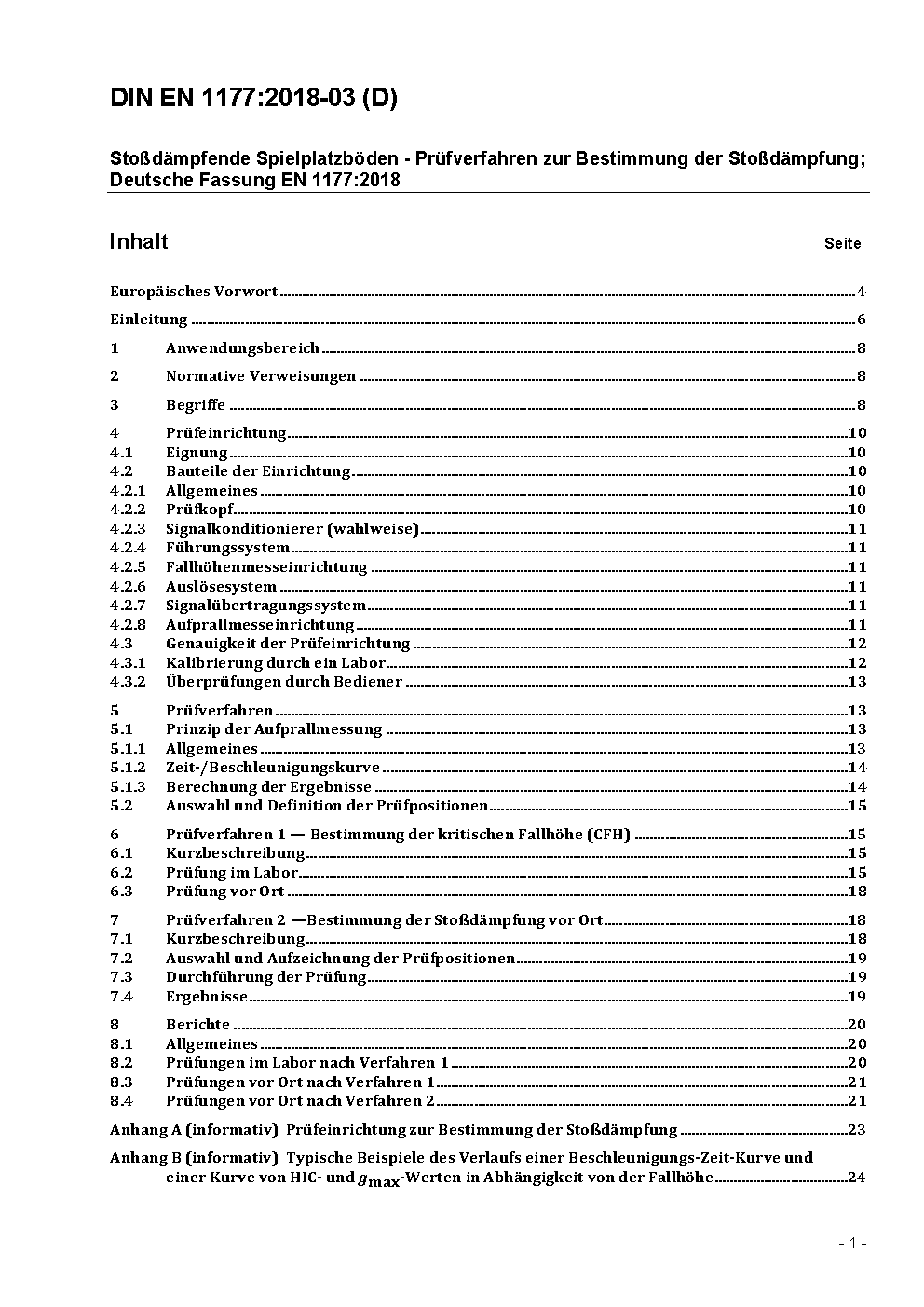 Stoßdämpfende Spielplatzböden - Bestimmung der kritischen Fallhöhe; Deutsche Fassung EN 1177:2008 / Achtung: Daneben gilt DIN EN 1177 (2002-03) noch bis 2009-05-31.