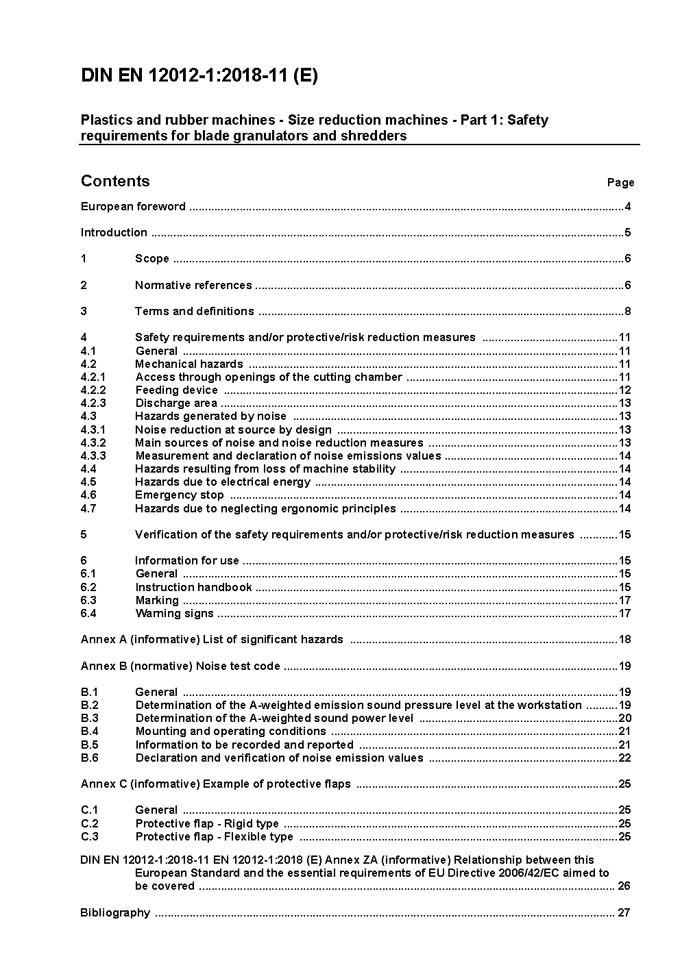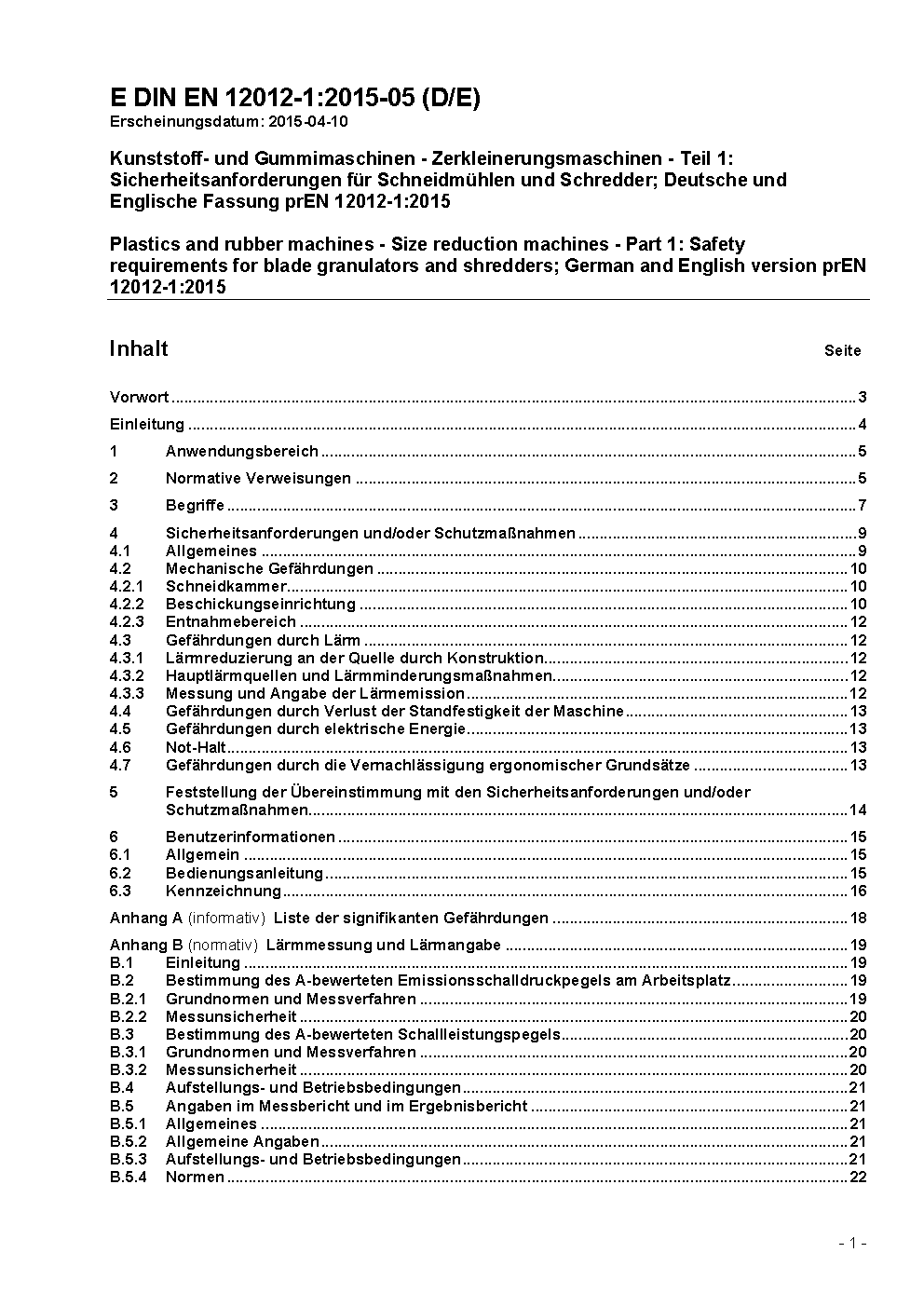 Kunststoff- und Gummimaschinen - Zerkleinerungsmaschinen - Teil 1: Sicherheitsanforderungen für Schneidmühlen und Schredder; Deutsche Fassung EN 12012-1:2018
