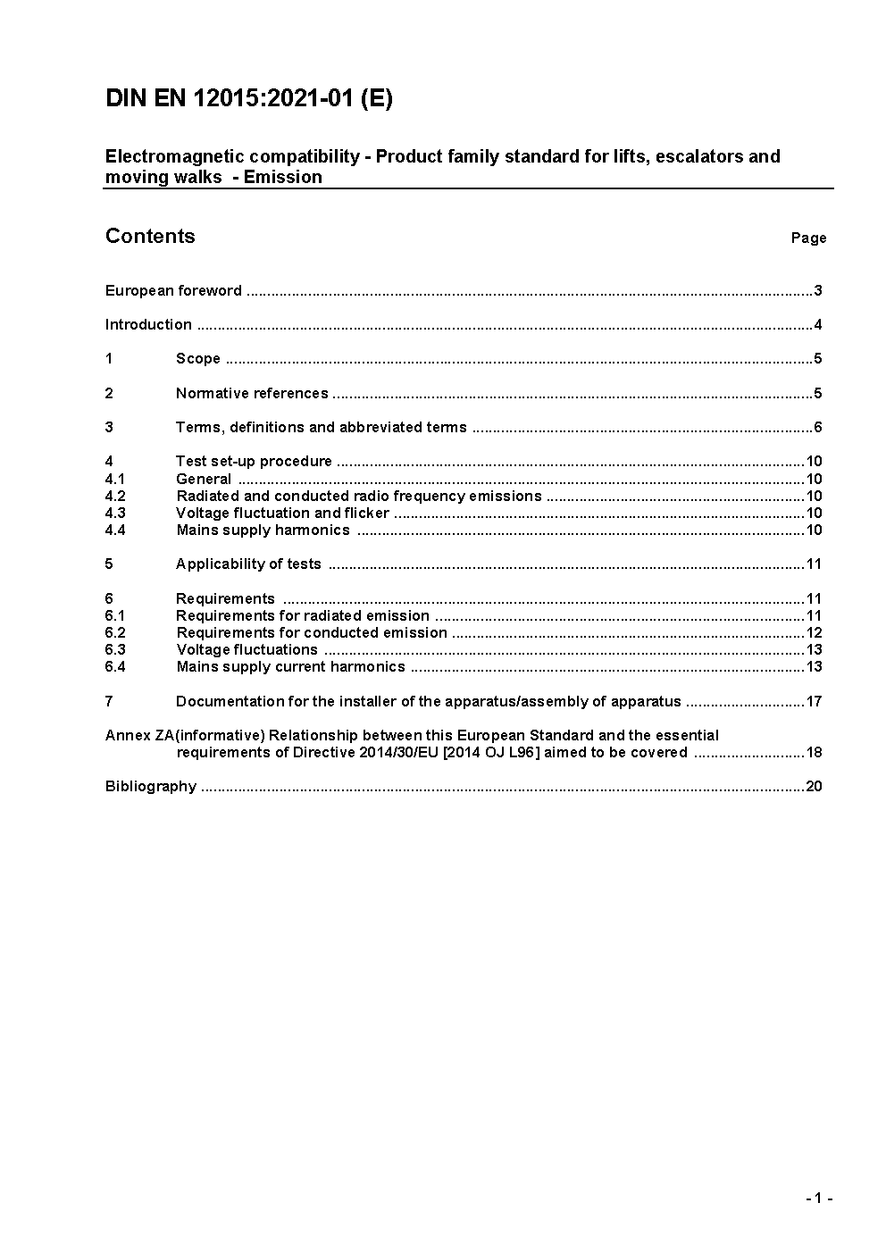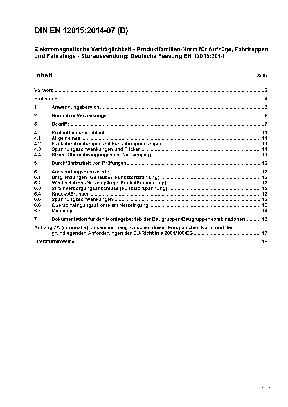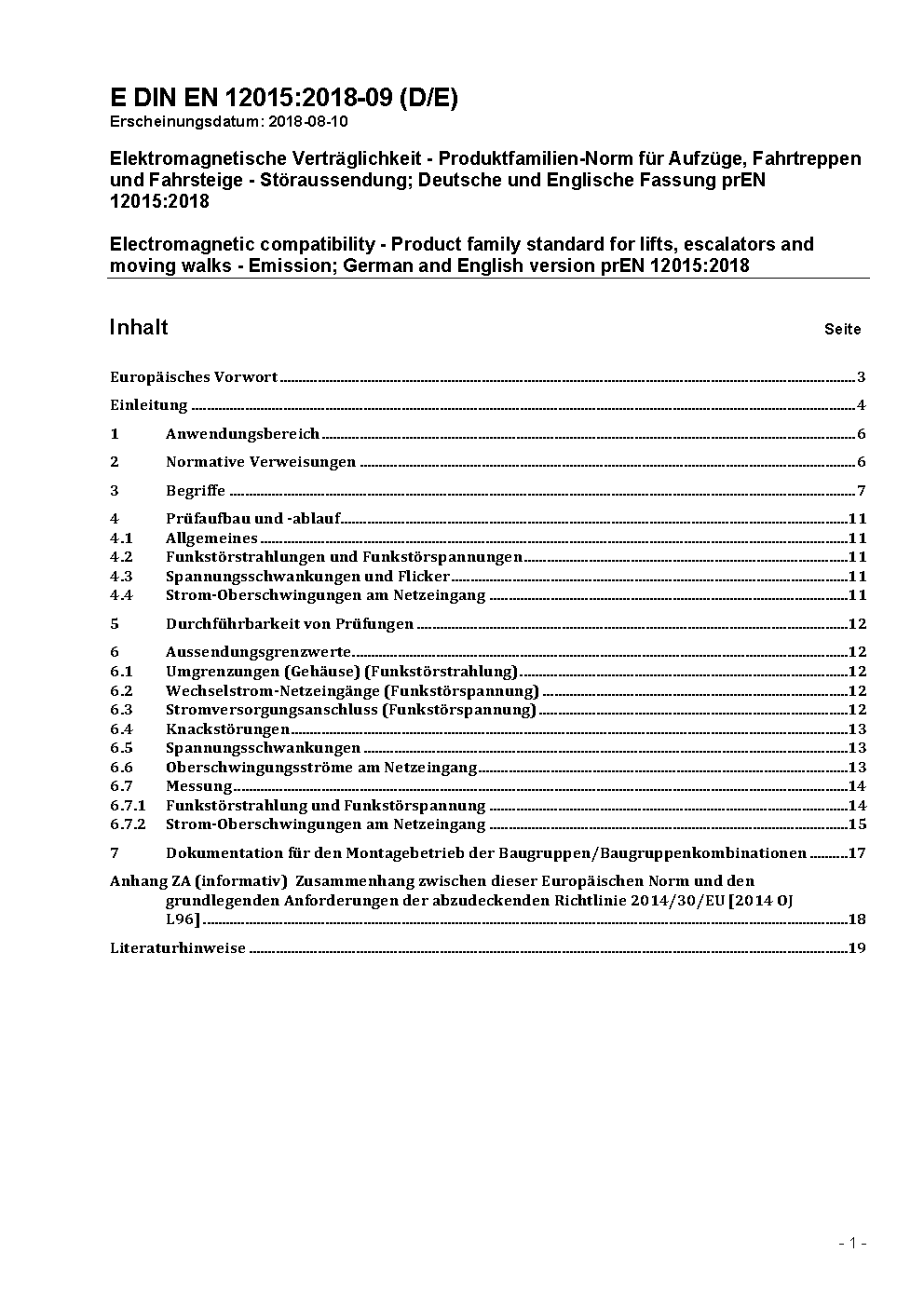 Electromagnetic compatibility - Product family standard for lifts, escalators and passenger conveyors - Emission; German version prEN 12015:2001