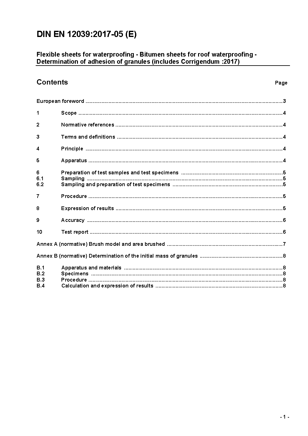 Flexible sheets for waterproofing - Bitumen sheets for roof waterproofing - Determination of adhesion of granules; German version EN 12039:1999