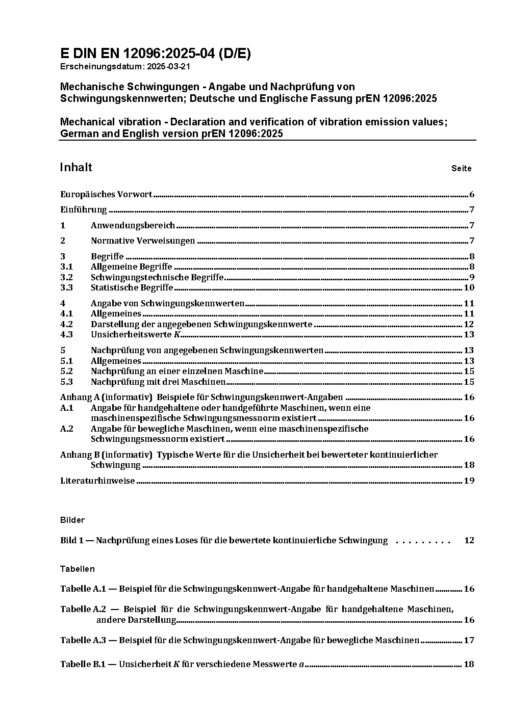Mechanische Schwingungen - Angabe und Nachprüfung von Schwingungskennwerten; Deutsche Fassung EN 12096:1997