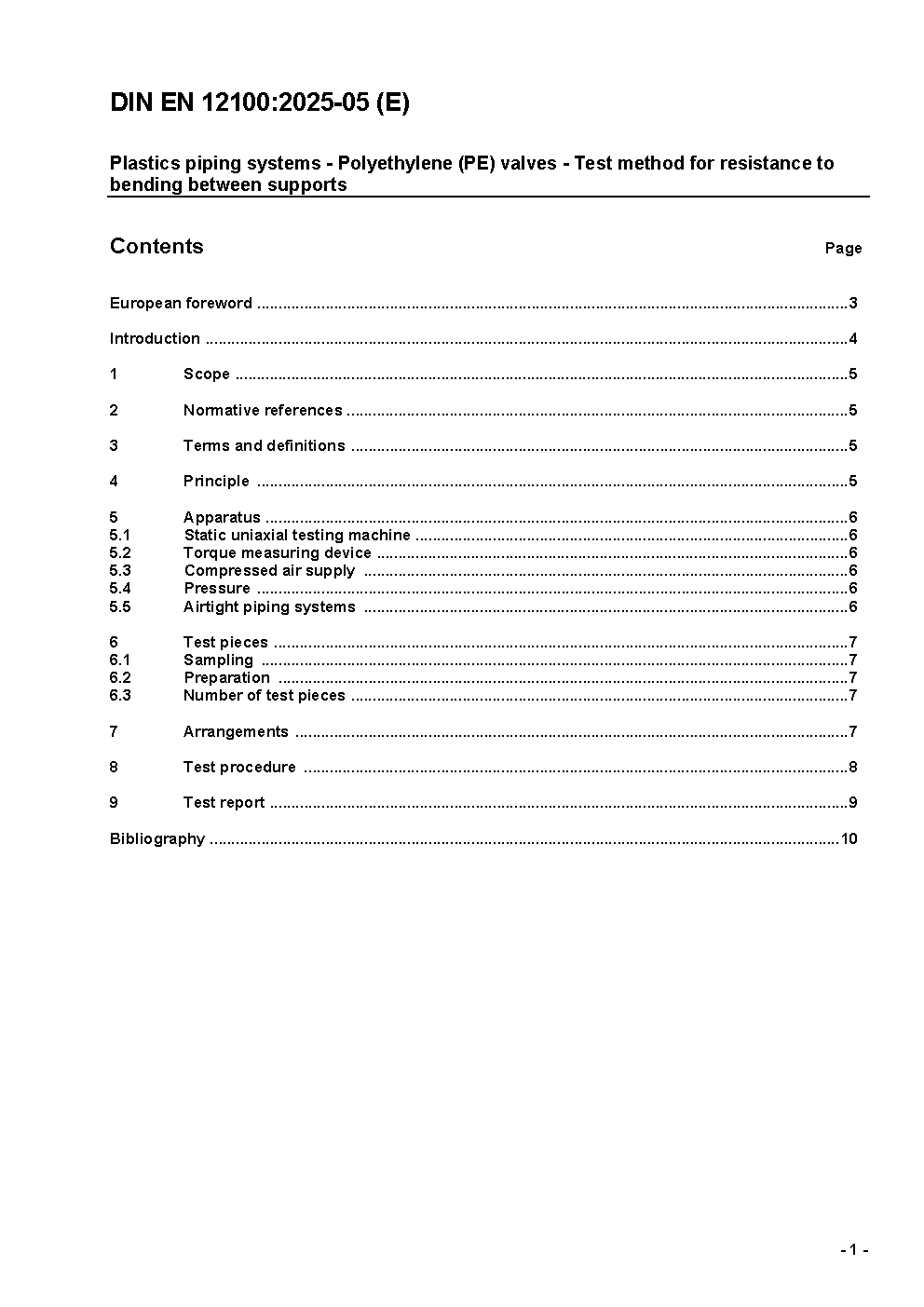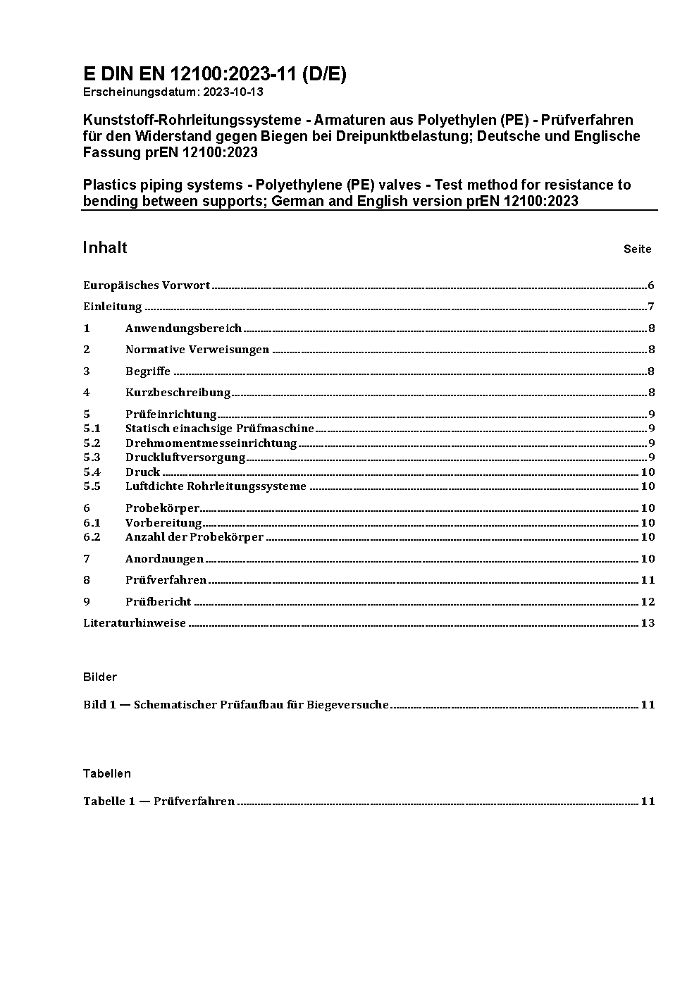 Plastics piping systems - Polyethylene (PE) valves - Test method for the resistance to bending between supports; German version EN 12100:1997