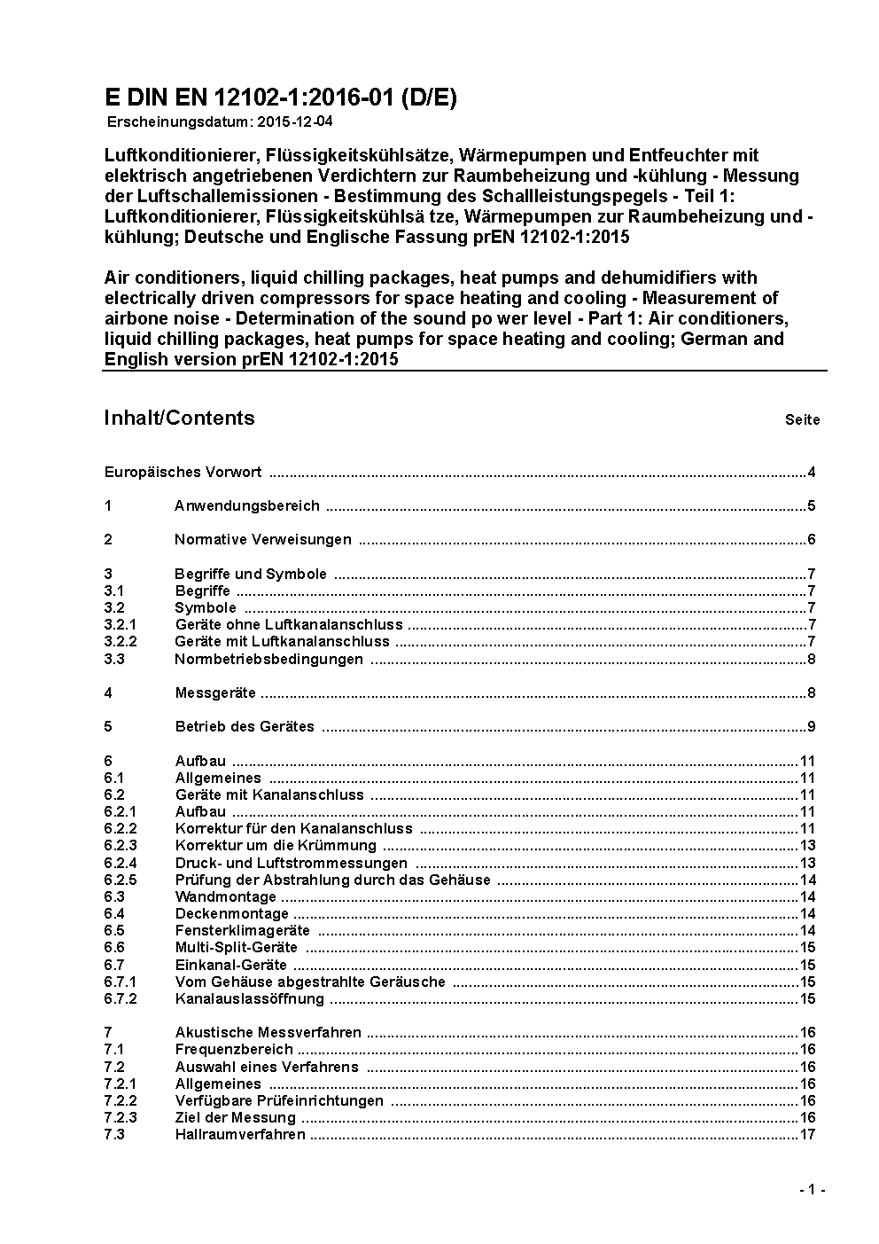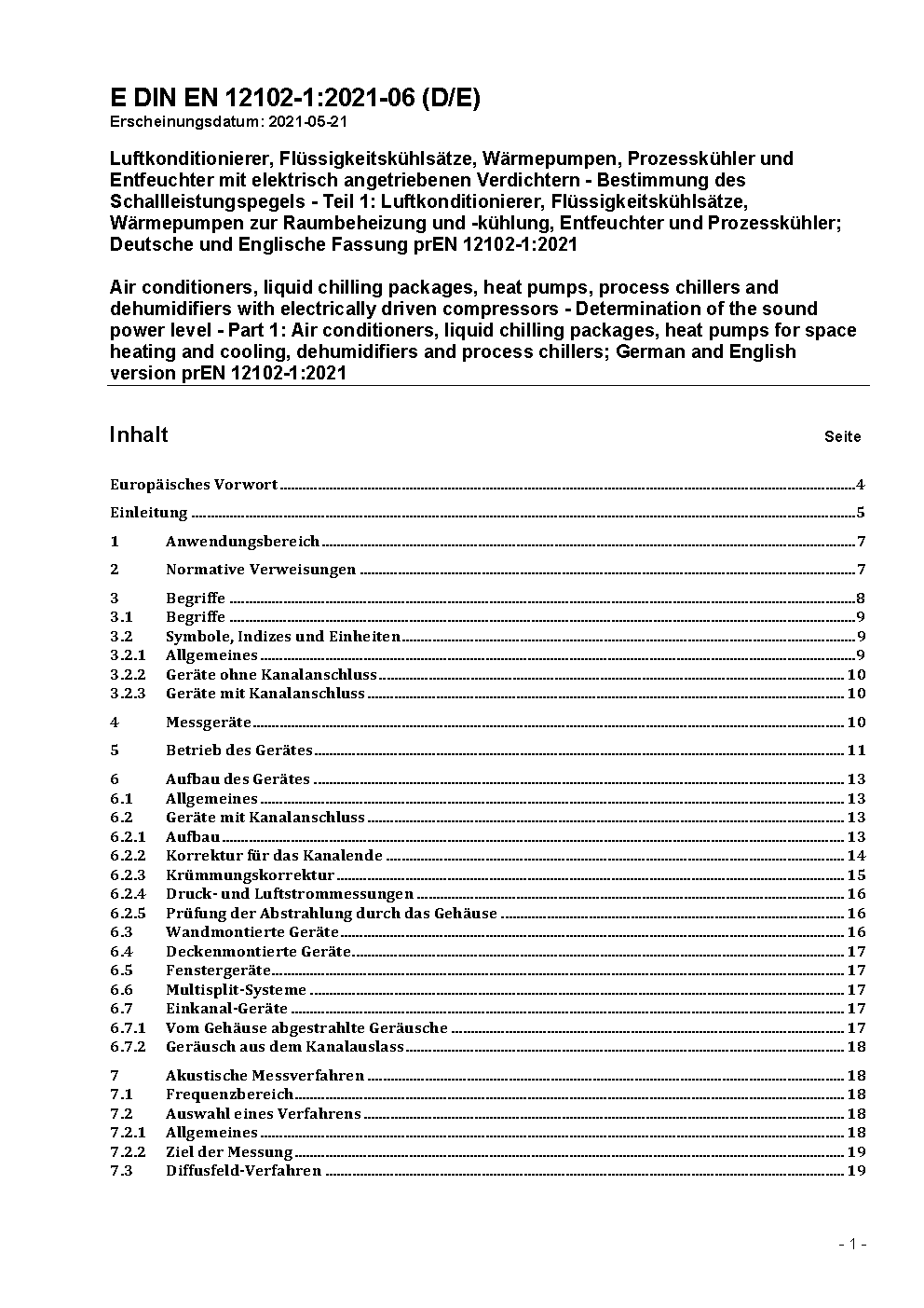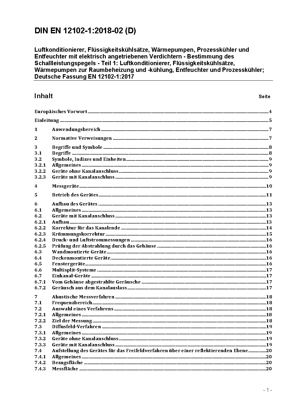 Luftkonditionierer, Flüssigkeitskühlsätze, Wärmepumpen, Prozesskühler und Entfeuchter mit elektrisch angetriebenen Verdichtern - Bestimmung des Schallleistungspegels - Teil 1: Luftkonditionierer, Flüssigkeitskühlsätze, Wärmepumpen zur Raumbeheizung und -kühlung, Entfeuchter und Prozesskühler; Deutsche Fassung EN 12102-1:2017