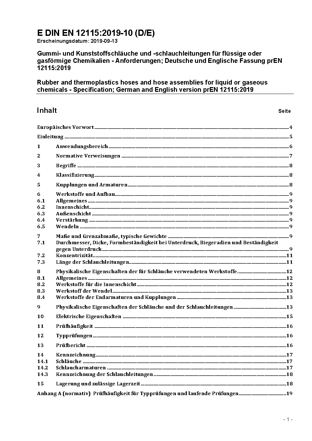 Gummi- und Kunststoffschläuche und -schlauchleitungen für flüssige oder gasförmige Chemikalien - Anforderungen; Deutsche Fassung EN 12115:2011