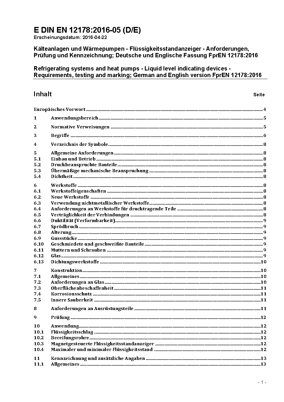 Kälteanlagen und Wärmepumpen - Flüssigkeitsstandanzeiger - Anforderungen, Prüfung und Kennzeichnung; Deutsche Fassung EN 12178:2016