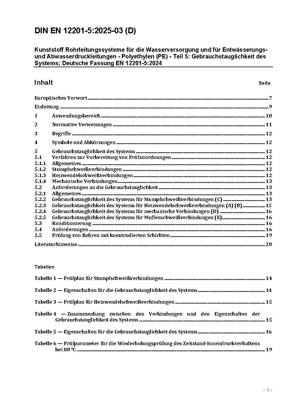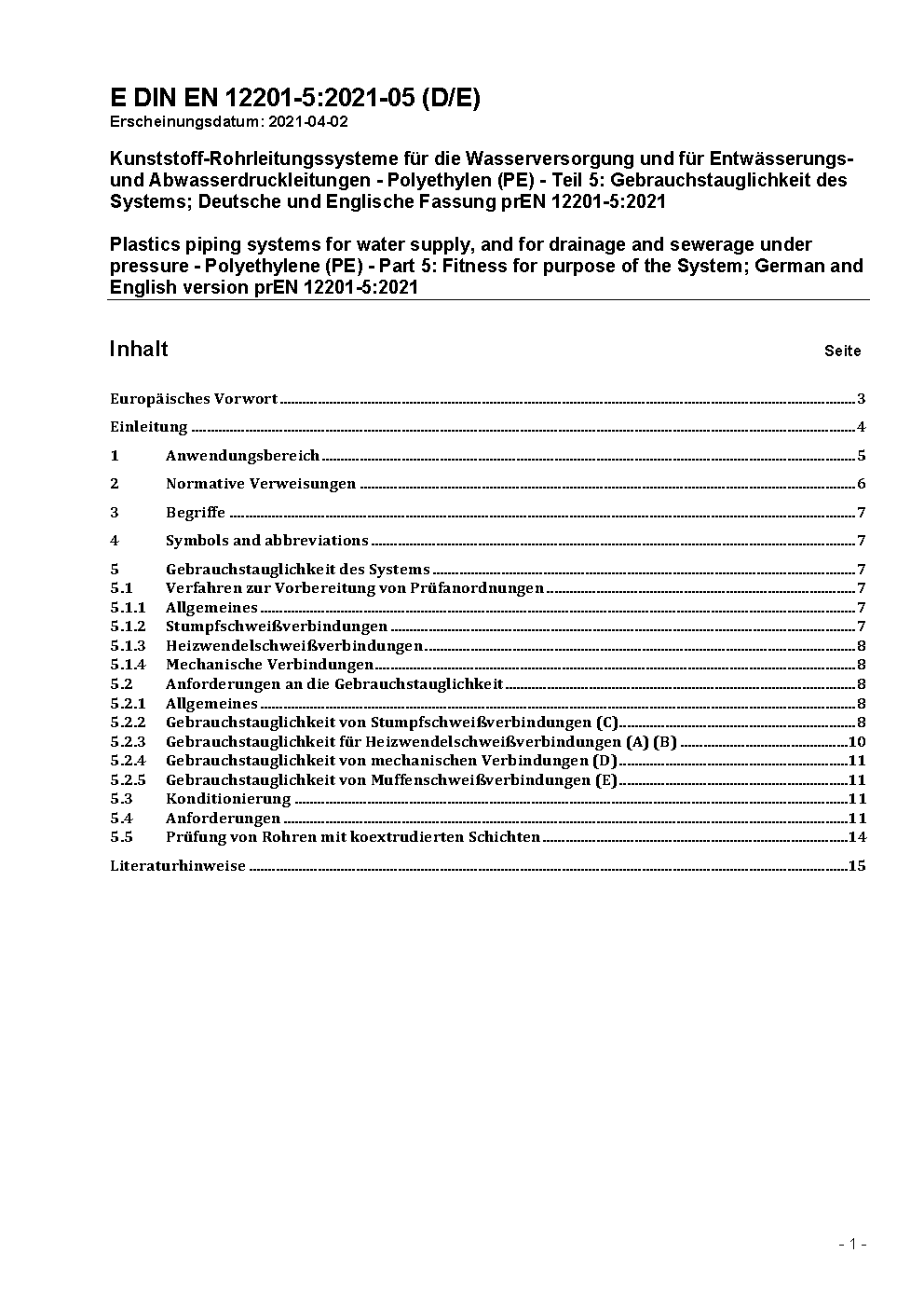 Kunststoff-Rohrleitungssysteme für die Wasserversorgung - Polyethylen (PE) - Teil 5: Gebrauchstauglichkeit des Systems; Deutsche Fassung prEN 12201-5:1995