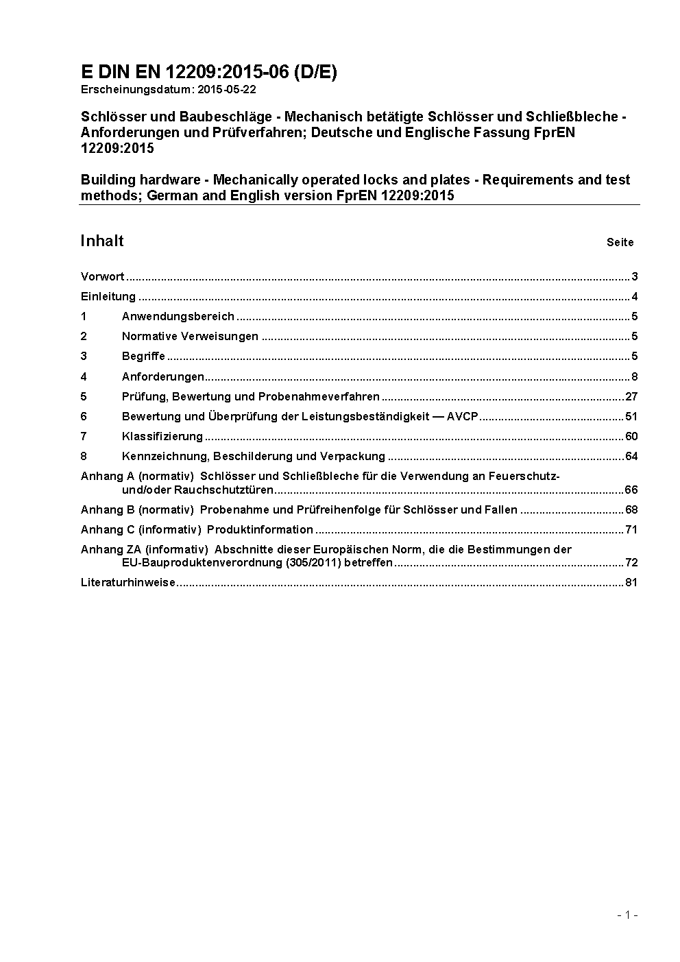 Schlösser und Baubeschläge - Schlösser - Mechanisch betätigte Schlösser und Schließbleche - Anforderungen und Prüfverfahren; Deutsche Fassung EN 12209:2003, Berichtigungen zu DIN EN 12209:2004-03; Deutsche Fassung EN 12209:2003/AC:2005