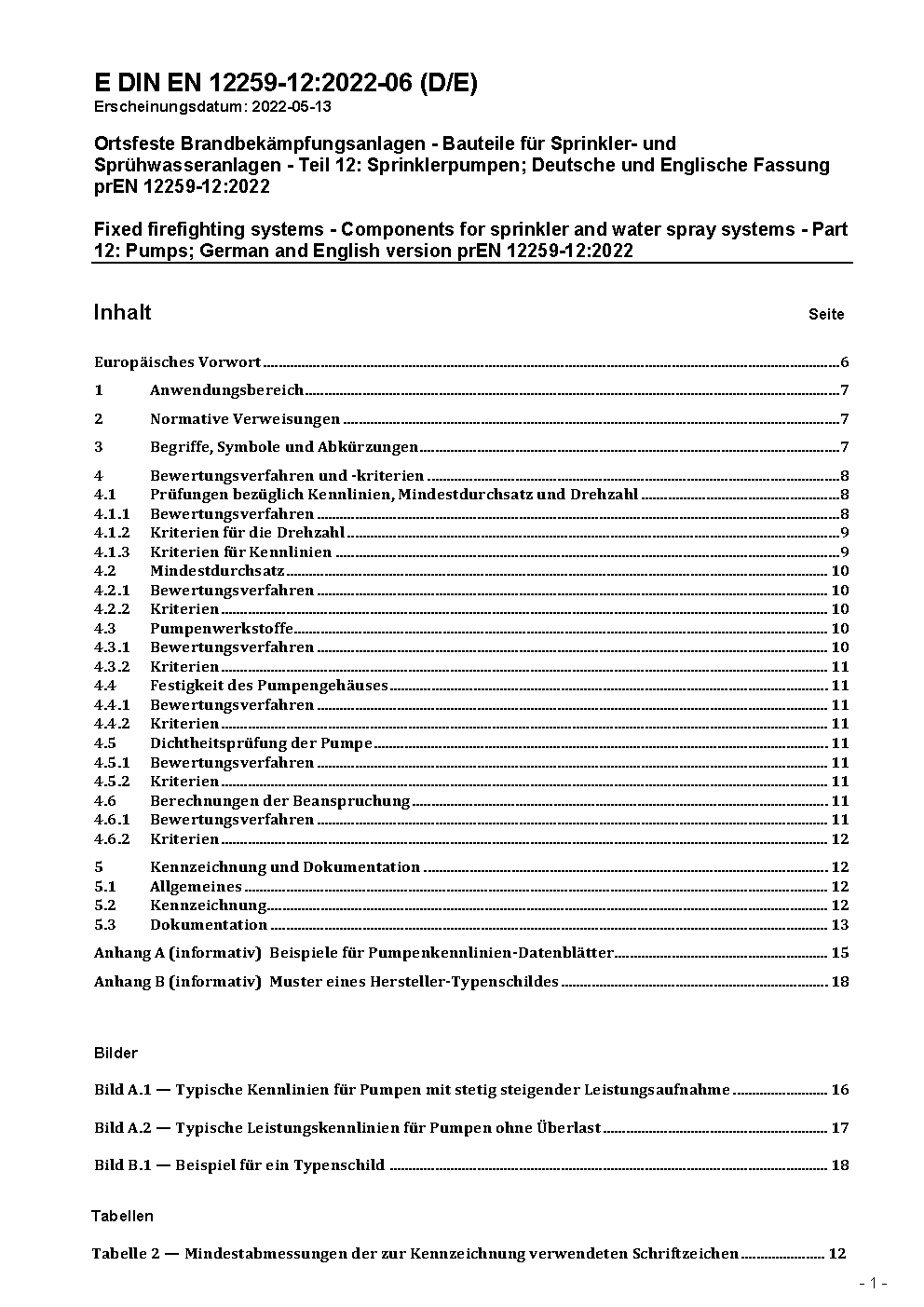 Ortsfeste Brandbekämpfungsanlagen - Bauteile für Sprinkler- und Sprühwasseranlagen - Teil 12: Sprinklerpumpen; Deutsche Fassung EN 12259-12:2023 / Achtung: Gilt in Verbindung mit DIN EN 12845 (2020-11)